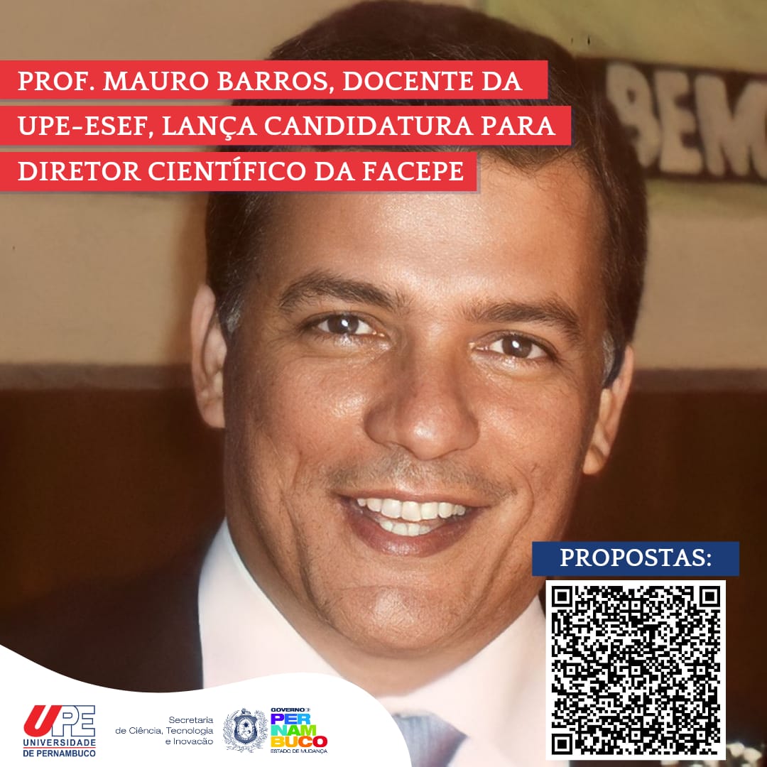 O Prof. Dr. Mauro Barros, docente da Escola Superior de Educação Física da Universidade de Pernambuco (ESEF/UPE), é candidato ao cargo de Diretor Científico da Fundação de Amparo à Ciência e Tecnologia do Estado de Pernambuco (FACEPE). A consulta à comunidade científica ocorrerá nos dias 26 e 27 de junho, com as normas estabelecidas pelo Edital FACEPE 07/2023, com o objetivo de elaborar uma lista tríplice de indicações para escolha da Governadora do Estado.