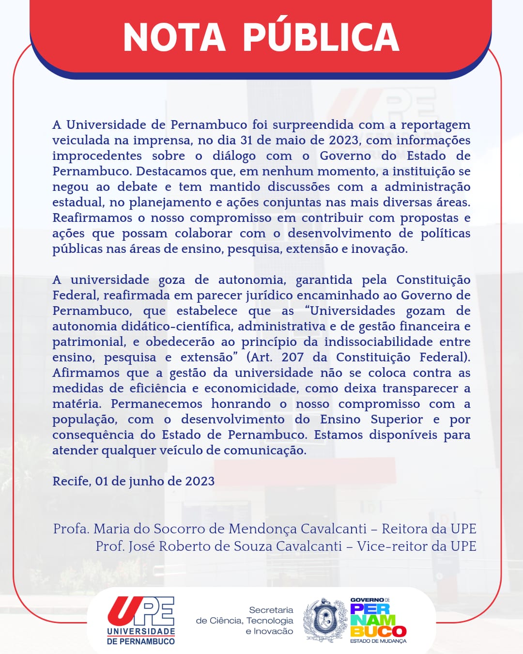 A Universidade de Pernambuco foi surpreendida com a reportagem veiculada na imprensa, no dia 31 de maio de 2023, com informações improcedentes sobre o diálogo com o Governo do Estado de Pernambuco. Destacamos que, em nenhum momento, a instituição se negou ao debate e tem mantido discussões com a administração estadual, no planejamento e ações conjuntas nas mais diversas áreas. Reafirmamos o nosso compromisso em contribuir com propostas e ações que possam colaborar com o desenvolvimento de políticas públicas nas áreas de ensino, pesquisa, extensão e inovação.