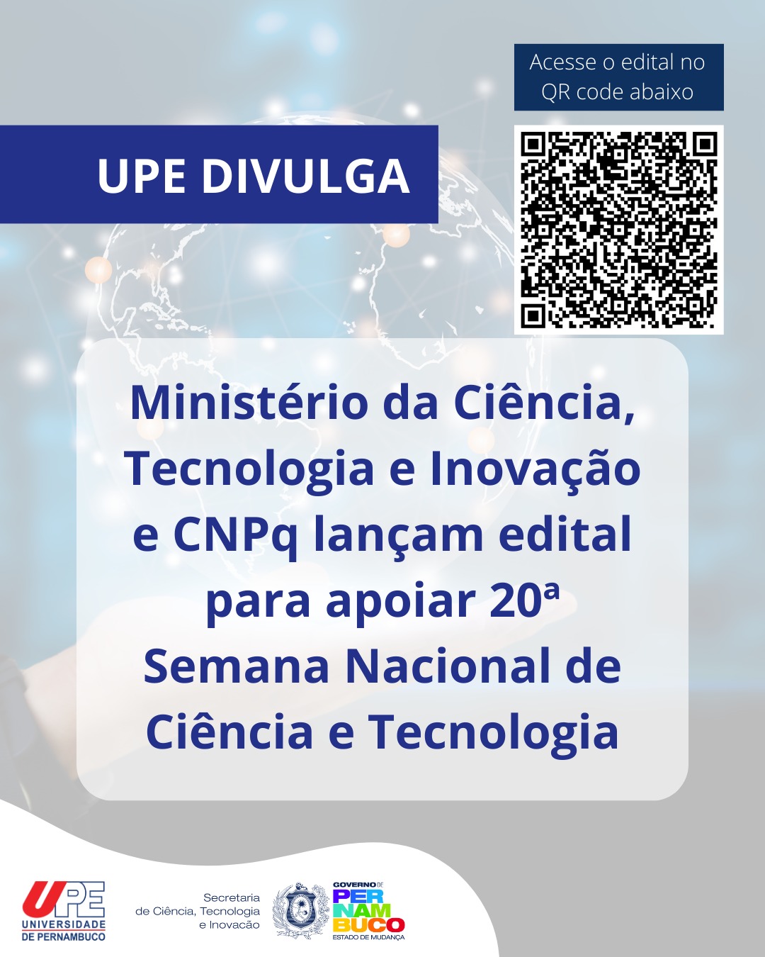 Ministério da Ciência, Tecnologia e Inovação e CNPq lançam edital de R$ 15 milhões para apoiar eventos da 20ª Semana Nacional de Ciência e Tecnologia (SNCT). Os recursos serão destinados a iniciativas de popularização da ciência em âmbito estadual, intermunicipal e escolar. A Semana Nacional é o maior evento de popularização científica do país e será realizada de 14 a 20 de outubro.