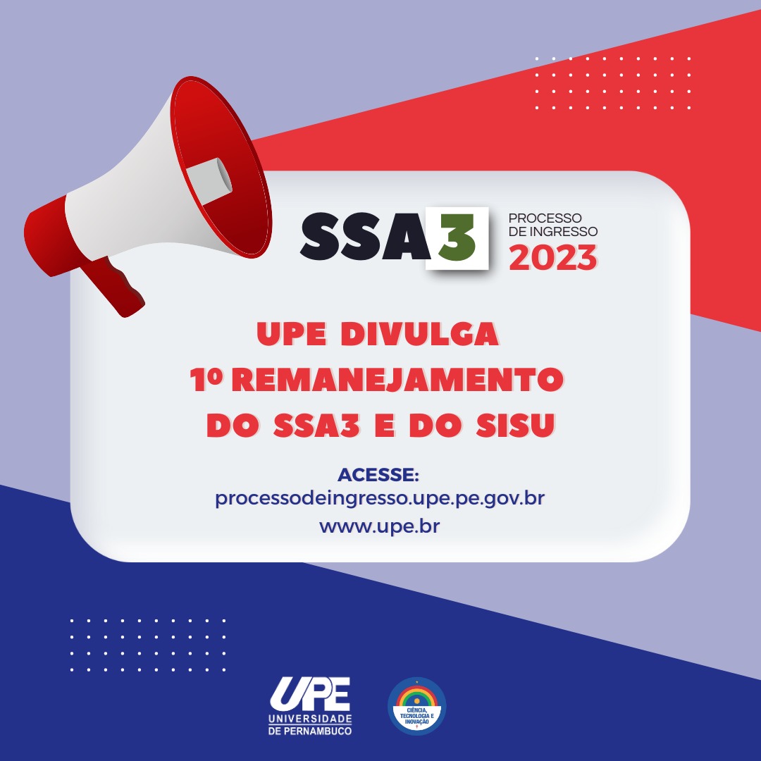 A Universidade de Pernambuco (UPE) divulgou a listagem do primeiro remanejamento do Sistema Seriado de Avaliação – 3a fase (SSA3) do Processo de Ingresso 2023 da instituição e do Sistema de Seleção Unificada (Sisu). Para conferir a lista completa basta acessar o endereço eletrônico: http://processodeingresso.upe.pe.gov.br.