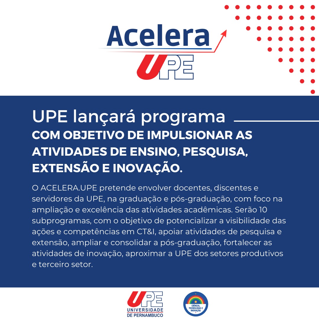 O ACELERA.UPE pretende envolver docentes, discentes e servidores da UPE, na graduação e pós-graduação, com foco na ampliação e excelência das atividades acadêmicas. Serão 10 subprogramas, com o objetivo de potencializar a visibilidade das ações e competências em CT&I, apoiar atividades de pesquisa e extensão, ampliar e consolidar a pós-graduação, fortalecer as atividades de inovação, aproximar a UPE dos setores produtivos e terceiro setor.