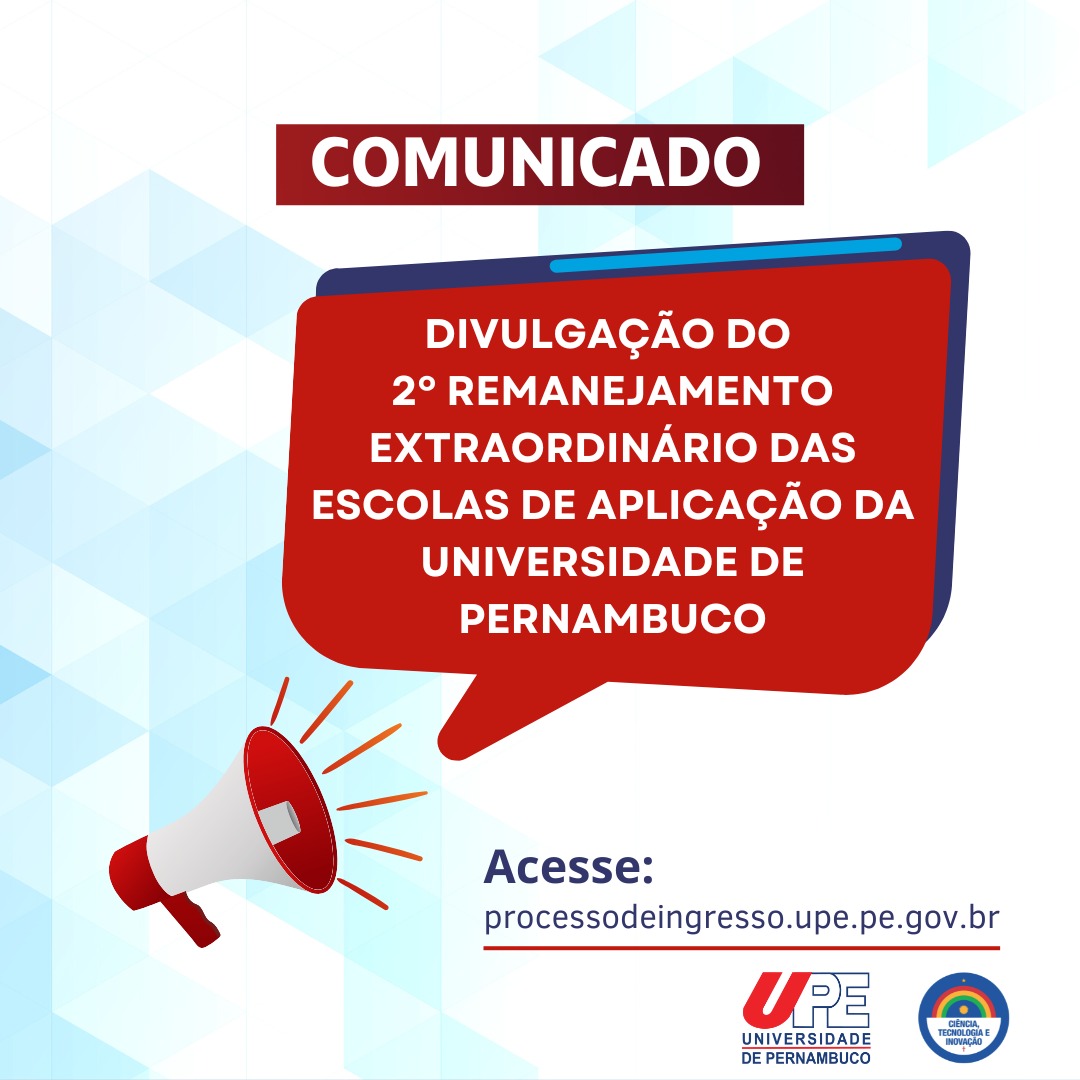 De acordo com o Edital/Manual do Candidato para o Exame de Seleção 2023 das Escolas de Aplicação da Universidade de Pernambuco, a Comissão Permanente de Concursos Acadêmicos da Universidade de Pernambuco (CPCA/UPE) torna público o calendário do SEGUNDO REMANEJAMENTO EXTRAORDINÁRIO, exclusivamente do 6º ano do Ensino Fundamental – Recife e do 1º ano do Ensino Médio - Petrolina, para vagas existentes ou que venham a surgir por falta à matrícula ou desistência. A listagem estará disponível na internet, através do endereço eletrônico http://processodeingresso.upe.pe.gov.br