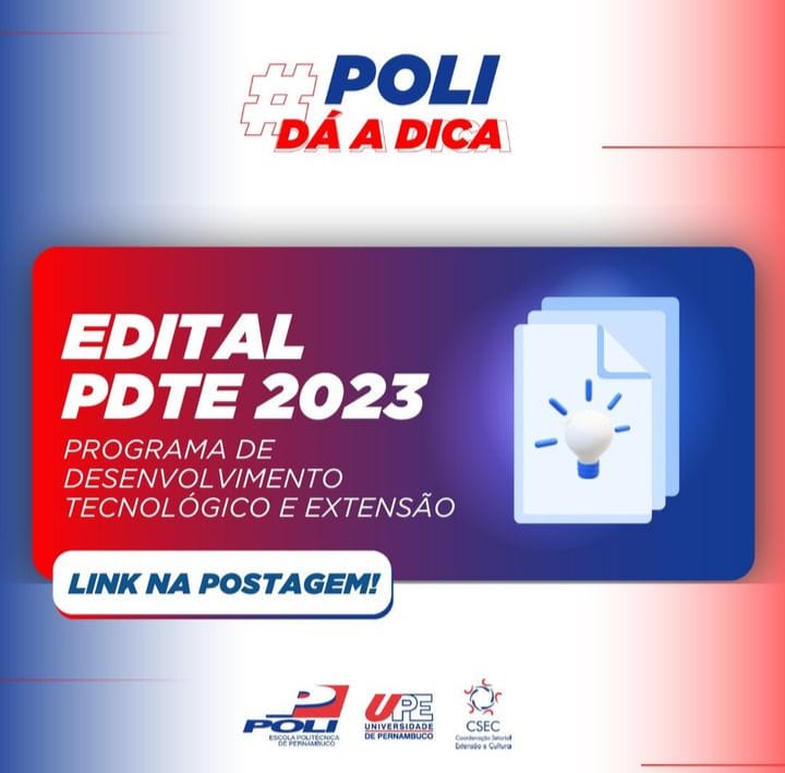 A Coordenação Setorial de Extensão e Cultura da Escola Politécnica da Universidade de Pernambuco (CSEC/POLI/UPE), torna público o Edital 2023 e convida os interessados a apresentarem propostas de projetos ao Programa de Desenvolvimento Tecnológico e Extensão (PDTE).