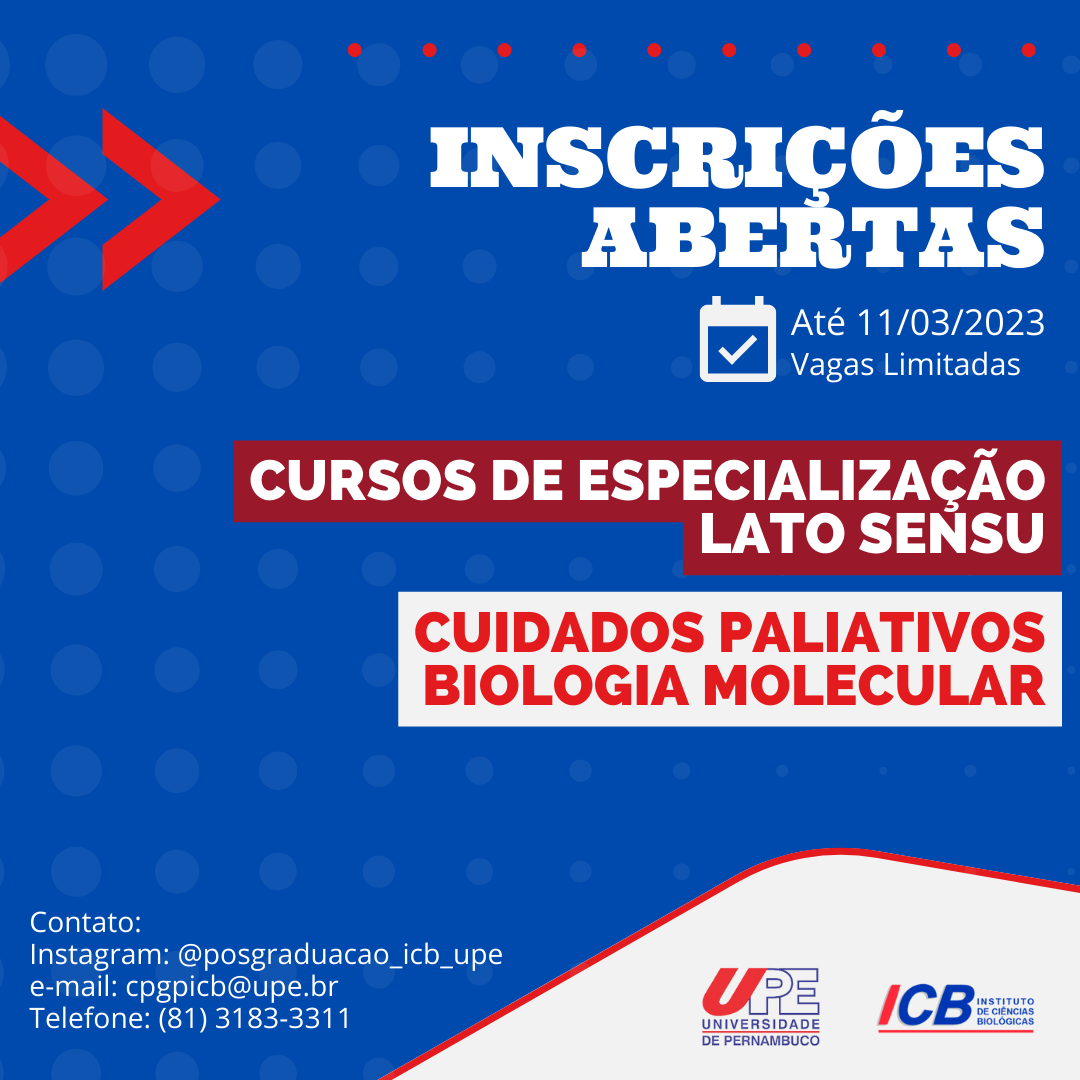 O Instituto de Ciências Biológicas da Universidade de Pernambuco (ICB/UPE) abre inscrições para os cursos de especialização em Biologia Molecular e Cuidados Paliativos até o dia 11 de março de 2023. Não perca essa oportunidade! As vagas são limitadas!