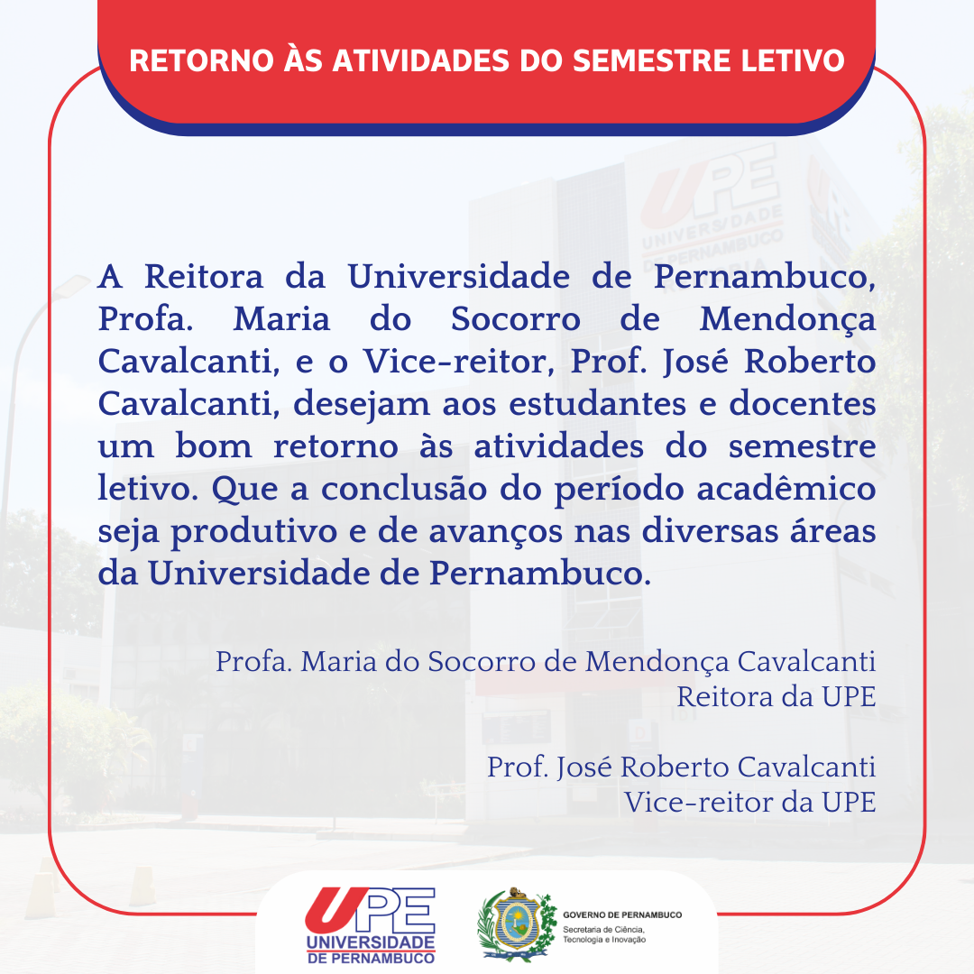 As atividades acadêmicas do semestre letivo de 2022.2 retornam nesta quarta-feira (01/02) em todas as unidades de educação e saúde da Universidade de Pernambuco. Neste sentido, a Reitora da Universidade de Pernambuco, Profa. Maria do Socorro de Mendonça Cavalcanti, e o Vice-Reitor, Prof. José Roberto Cavalcanti, desejam aos estudantes e docentes um período produtivo e de avanços nas diversas áreas da UPE.