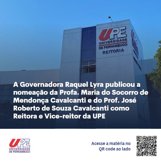 Na próxima quarta-feira (11/01), a Governadora do Estado de Pernambuco, Raquel Lyra, participará da solenidade de posse dos professores Maria do Socorro de Mendonça Cavalcanti e José Roberto de Souza Cavalcanti, para exercerem os cargos de Reitora e Vice-Reitor, respectivamente, da Universidade de Pernambuco (UPE) no quadriênio 2023-2026. A cerimônia acontecerá no Auditório Ênio Cantarelli, do Pronto-Socorro Cardiológico Universitário de Pernambuco - Prof. Luiz Tavares (PROCAPE), a partir das 19:00 horas.