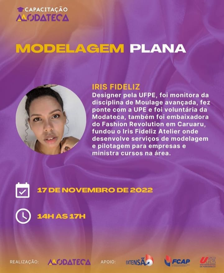 Nesta quinta-feira (17), a Modateca, programa da Faculdade de Ciências da Administração e Direito de Pernambuco (FCAP/UPE) terá o prazer de receber Iris Fideliz para ministrar uma aula com o tema “Modelagem Plana”, das 14h às 17h.