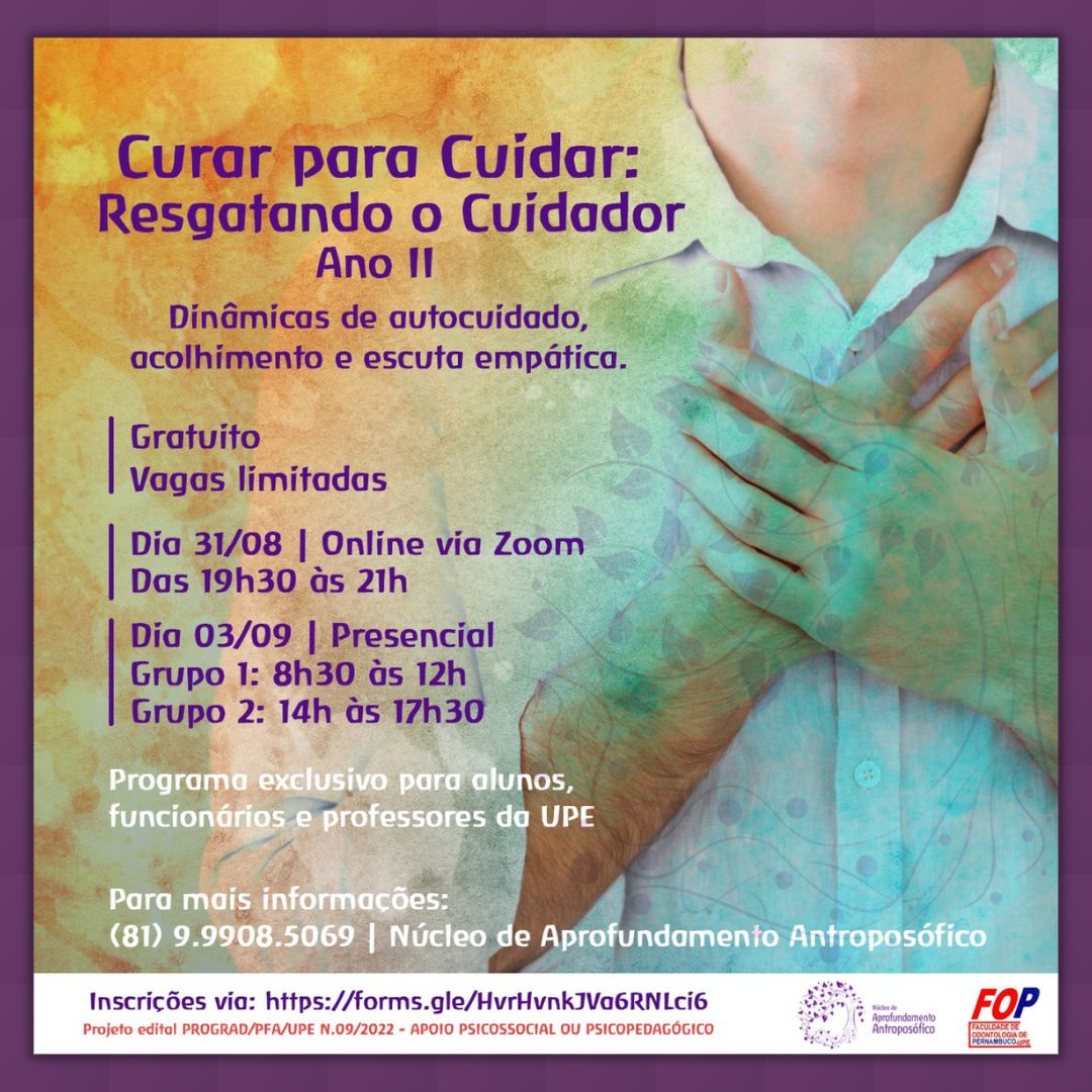 A Universidade de Pernambuco (UPE), por meio da Pró-Reitoria de Graduação (PROGRAD) e da Faculdade de Odontologia de Pernambuco (FOP/UPE), promove o projeto “Curar para cuidar: Resgatando o cuidador”, onde alunos, professores e servidores da UPE poderão trabalhar o autocuidado, através de vivências práticas que possibilitem um suporte ao equilíbrio do corpo e da mente.