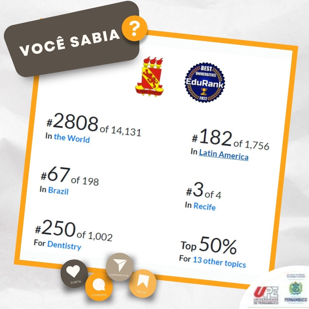 Ainda de acordo com o EduRank, a UPE ficou em 32º lugar em Medicina no Brasil e 1106º no Mundo com 2.516 publicações feitas e 34.866 citações recebidas. Os principais temas de pesquisa foram: Cirurgia, Odontologia, Ciências da Saúde, Saúde Pública, Fisioterapia.