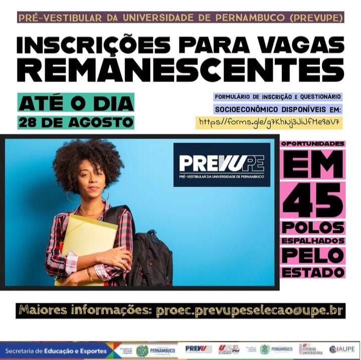 As inscrições para preenchimento de vagas remanescentes do Pré-vestibular da Universidade de Pernambuco (UPE) foram prorrogadas até o dia 28 de agosto. Totalmente gratuito, com material didático exclusivo, o PREVUPE tem oportunidades disponíveis em 45 polos espalhados pelo estado.
