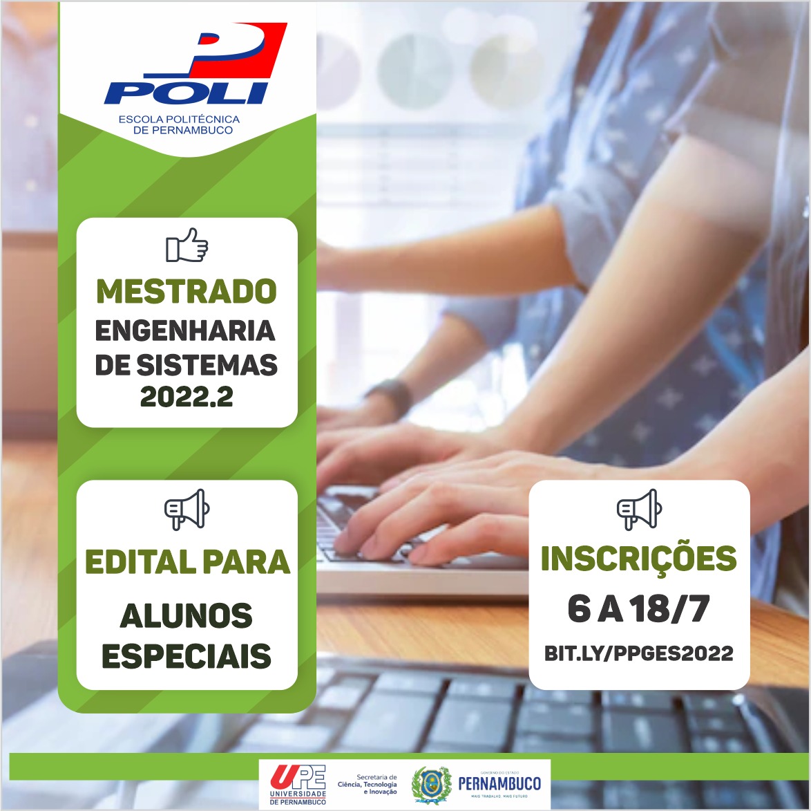 A Coordenação do Programa de Pós-Graduação em Engenharia de Sistemas da Escola Politécnica da Universidade de Pernambuco (PPGS/POLI/UPE) publica edital de seleção de alunos especiais para o mestrado em engenharia de sistemas para o segundo semestre letivo de 2022.