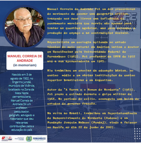 Nascido em 3 de agosto de 1922, no Engenho Jundiá, município de Vicência, localizado na Zona da Mata Norte pernambucana, Manuel Correia de Andrade foi um professor, pesquisador, geógrafo, advogado e historiador que deu relevantes contribuições para a educação do país.