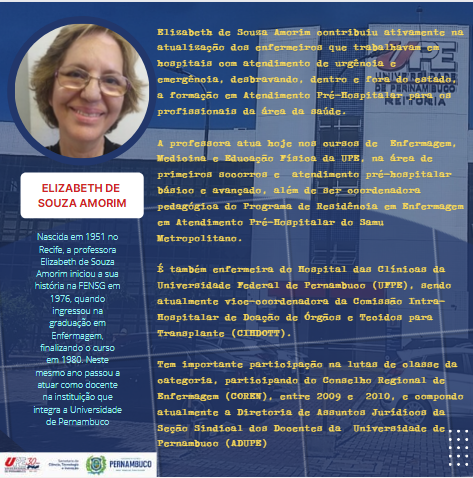 Nascida em 1951 no Recife, a professora Elizabeth de Souza Amorim iniciou a sua história na FENSG em 1976, quando ingressou na graduação em Enfermagem, finalizando o curso em 1980. Neste mesmo ano passou a atuar como docente na instituição.