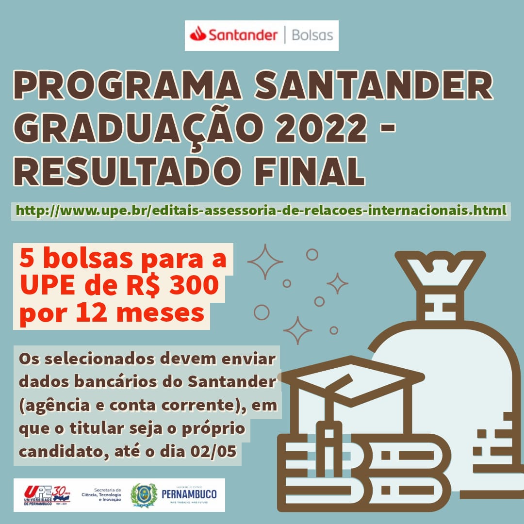 A Assessoria de Relações Internacionais da Universidade de Pernambuco divulgou o resultado final do edital de seleção do programa de bolsas “Santander Graduação 2022”.