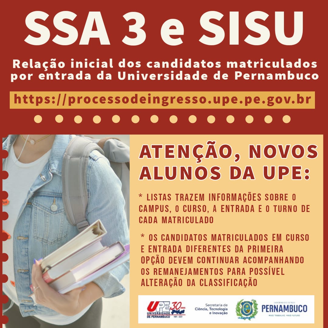 A Comissão Permanente de Concursos Acadêmicos da Universidade de Pernambuco (CPCA/UPE) divulgou nesta sexta-feira (29) a relação inicial dos candidatos matriculados por entrada da terceira fase do Sistema Seriado de Avaliação (SSA 3) e do Sistema de Seleção Unificada (SISU).