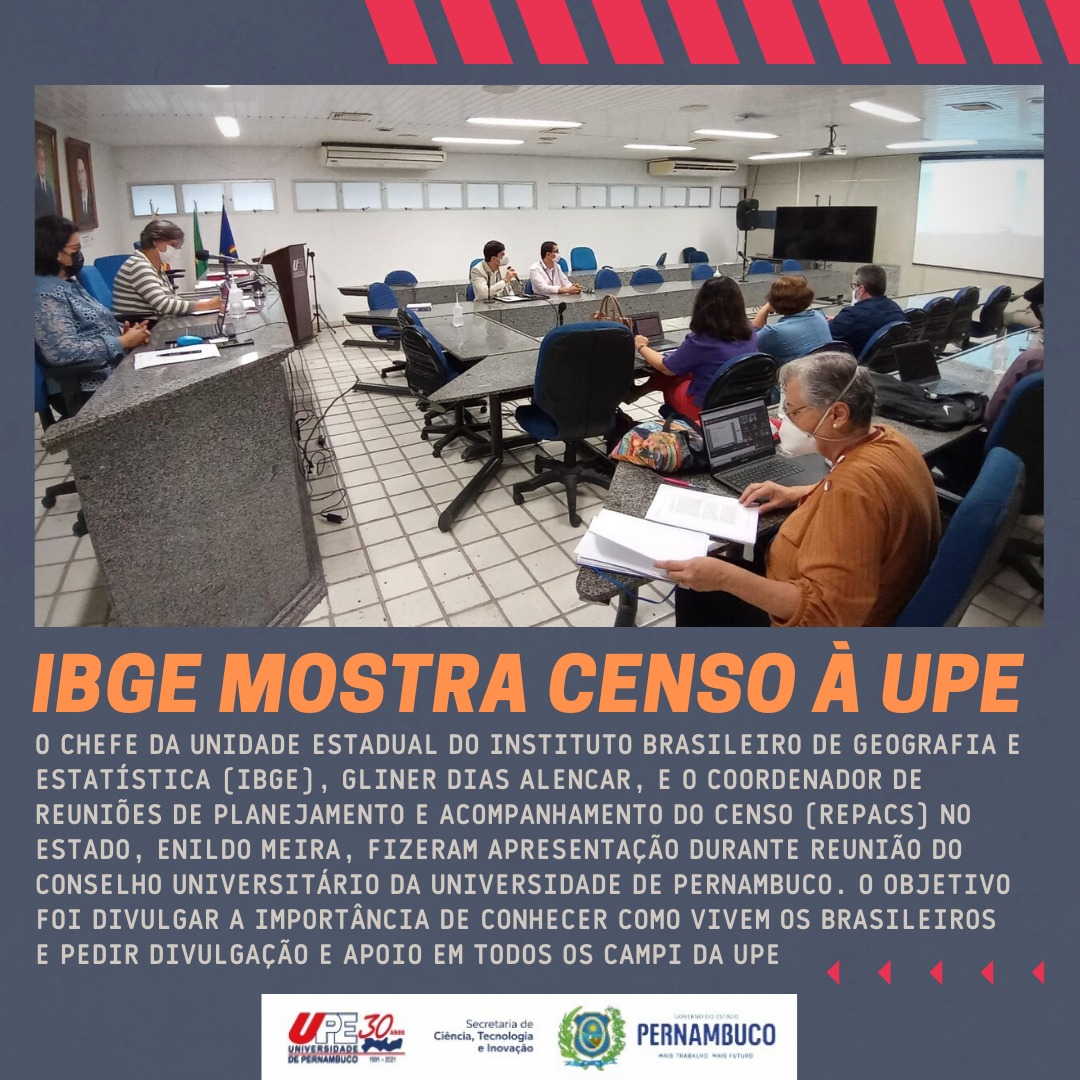 O chefe da unidade estadual do instituto Brasileiro de Geografia e Estatística (IBGE), Gliner Dias Alencar, e o coordenador de Reuniões de Planejamento e Acompanhamento do Censo (Repacs) no estado, Enildo Meira, participaram na manhã desta sexta-feira (29) da reunião do Conselho Universitário (CONSUN) da Universidade de Pernambuco.