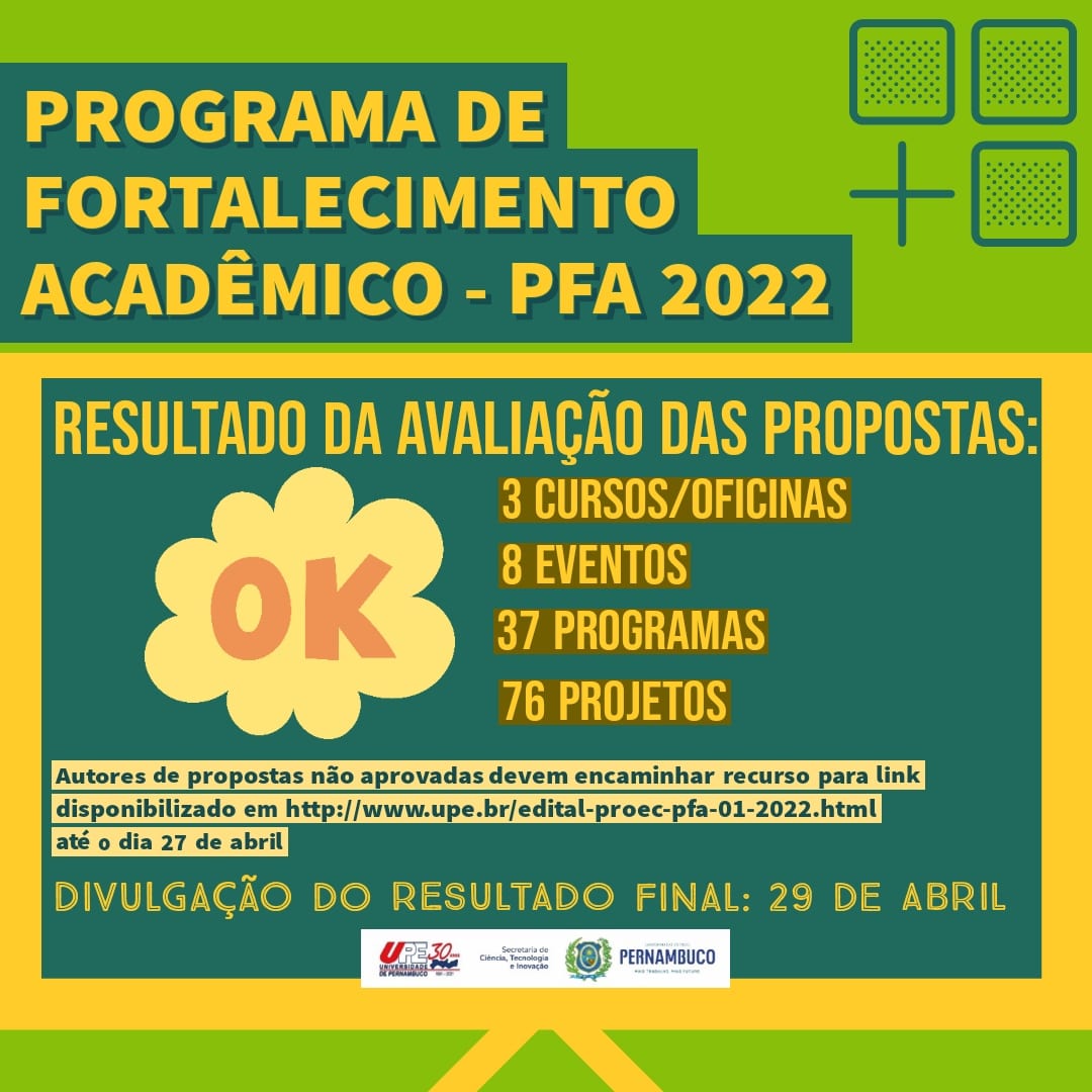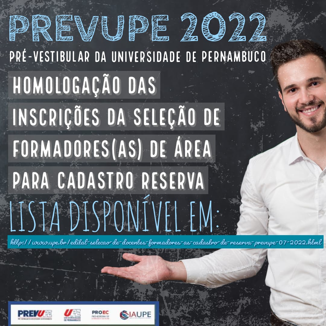 A Pró-reitoria de Extensão e Cultura (PROEC) divulgou a lista das inscrições homologadas para o cadastro reserva de Formadores(as) de Área do Pré-vestibular da Universidade de Pernambuco (PREVUPE).