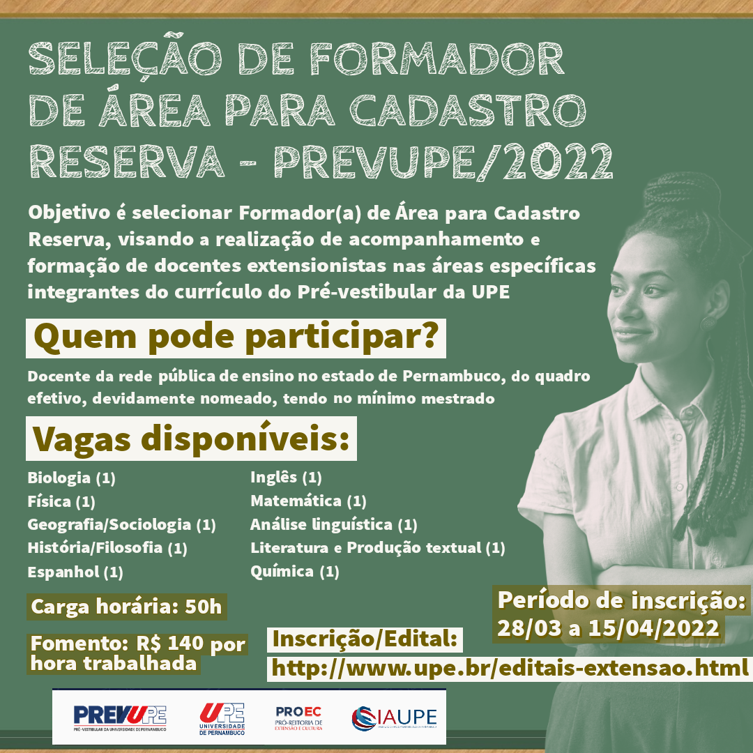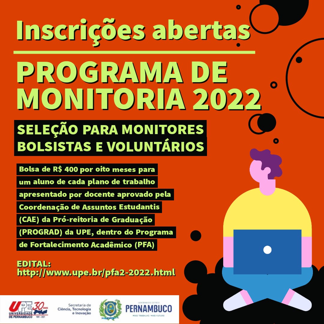 A Pró-reitoria de Graduação da Universidade de Pernambuco (PROGRAD/UPE), através da Coordenação de Assuntos Estudantis (CAE) e por meio do Programa de Fortalecimento Acadêmico (PFA), abriu seleção para monitores bolsistas e voluntários dentro do seu Programa de Monitoria 2022.