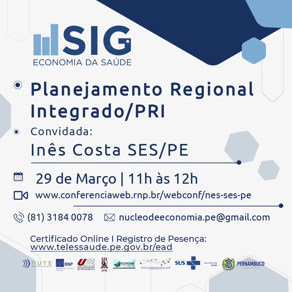 O Núcleo Estadual de Telessaúde, vinculado à Secretaria Estadual de Saúde (NET-SES-PE), realiza no dia 29 de março uma teleconferência sobre Planejamento Regional Integrado (PRI) dentro das ações do Grupo de Interesses Especiais (SIG) em Economia da Saúde.
