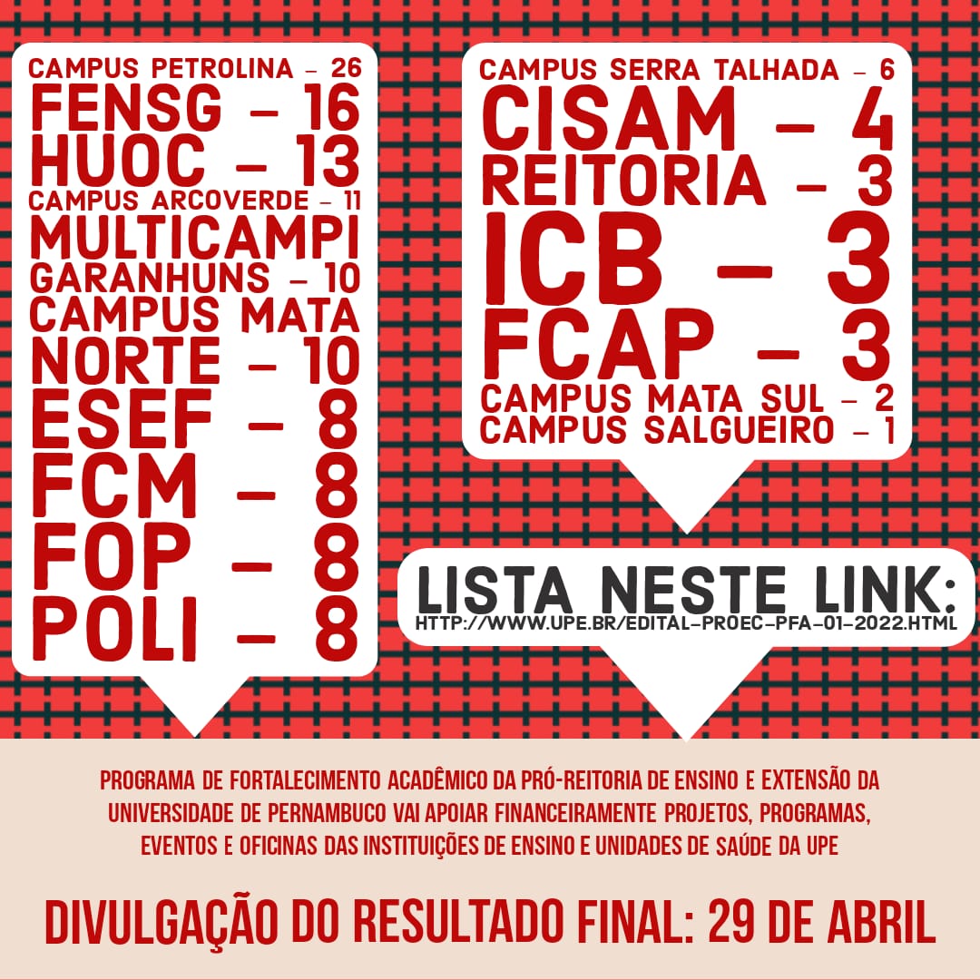 A lista está disponível neste link: http://www.upe.br/edital-proec-pfa-01-2022.html