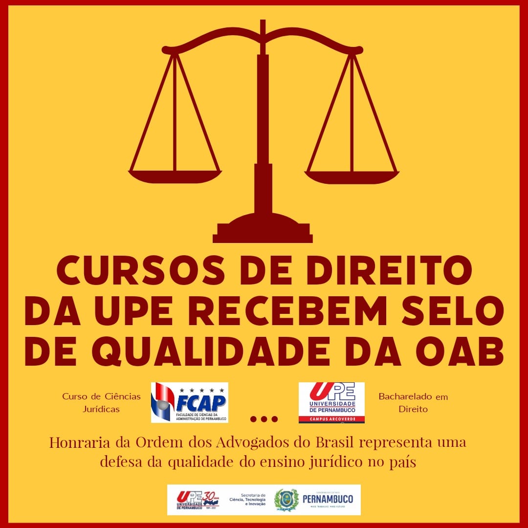 Os cursos de Direito da Universidade de Pernambuco, oferecidos na Faculdade de Administração e Direito de Pernambuco (FCAP/UPE) e na unidade de Arcoverde que integra o Multicampi Garanhuns, foram agraciados com o Selo de Qualidade da Ordem dos Advogados do Brasil (OAB).