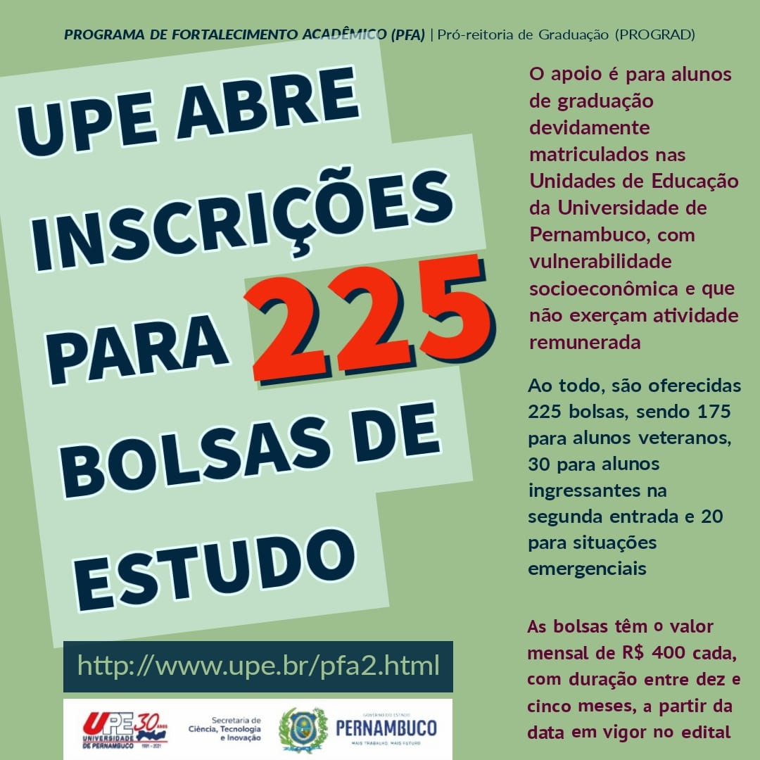 O apoio financeiro de R$ 400 mensais é direcionado aos estudantes de graduação com vulnerabilidade socioeconômica, que não exerçam atividade remunerada e que estejam matriculados nas unidades de educação da UPE.