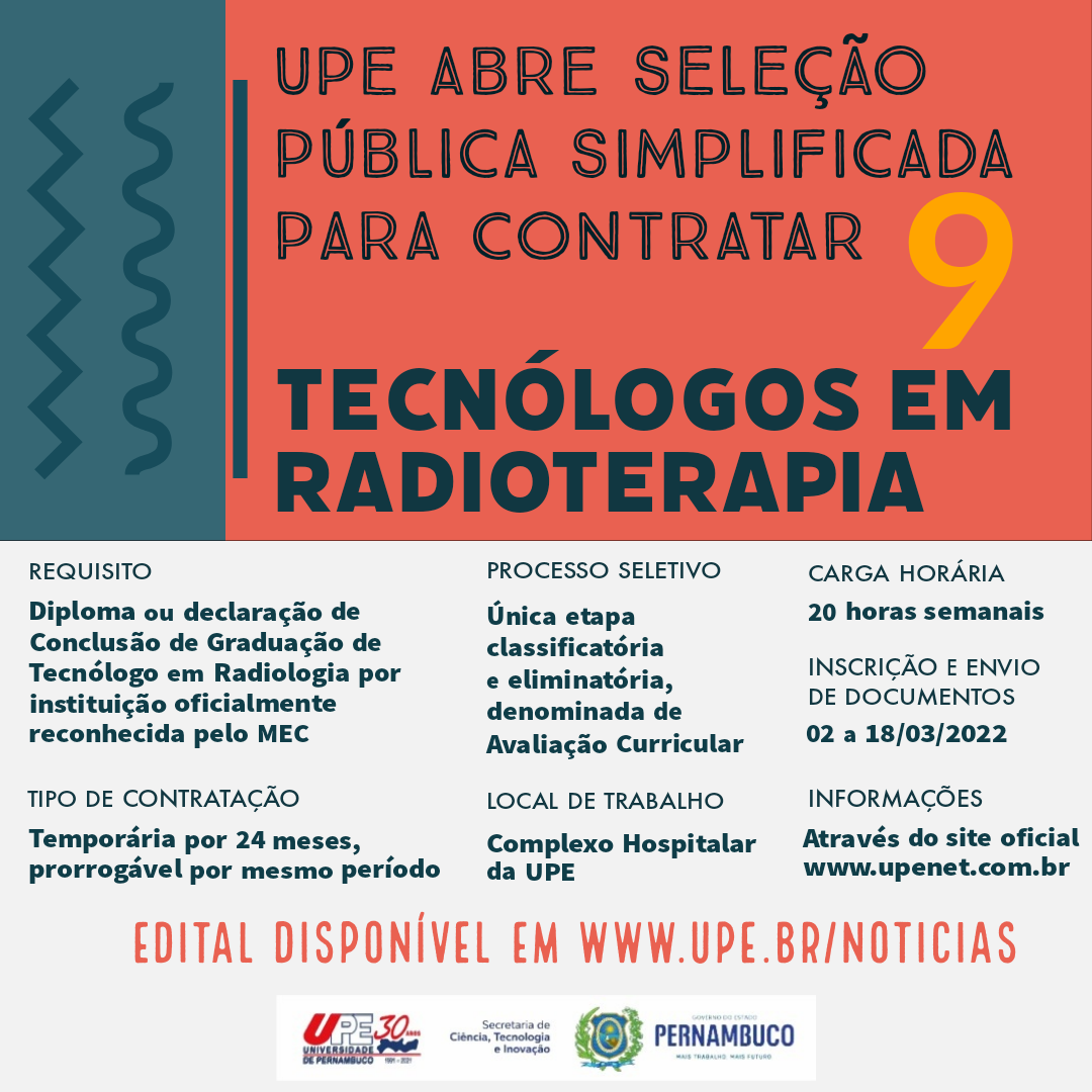 Com autorização da Secretaria de Administração (SAD), a Universidade de Pernambuco iniciou uma seleção pública simplificada para a contratação em regime temporário de nove tecnólogos em radioterapia. O edital foi publicado na edição do Diário Oficial do Estado deste sábado (26).