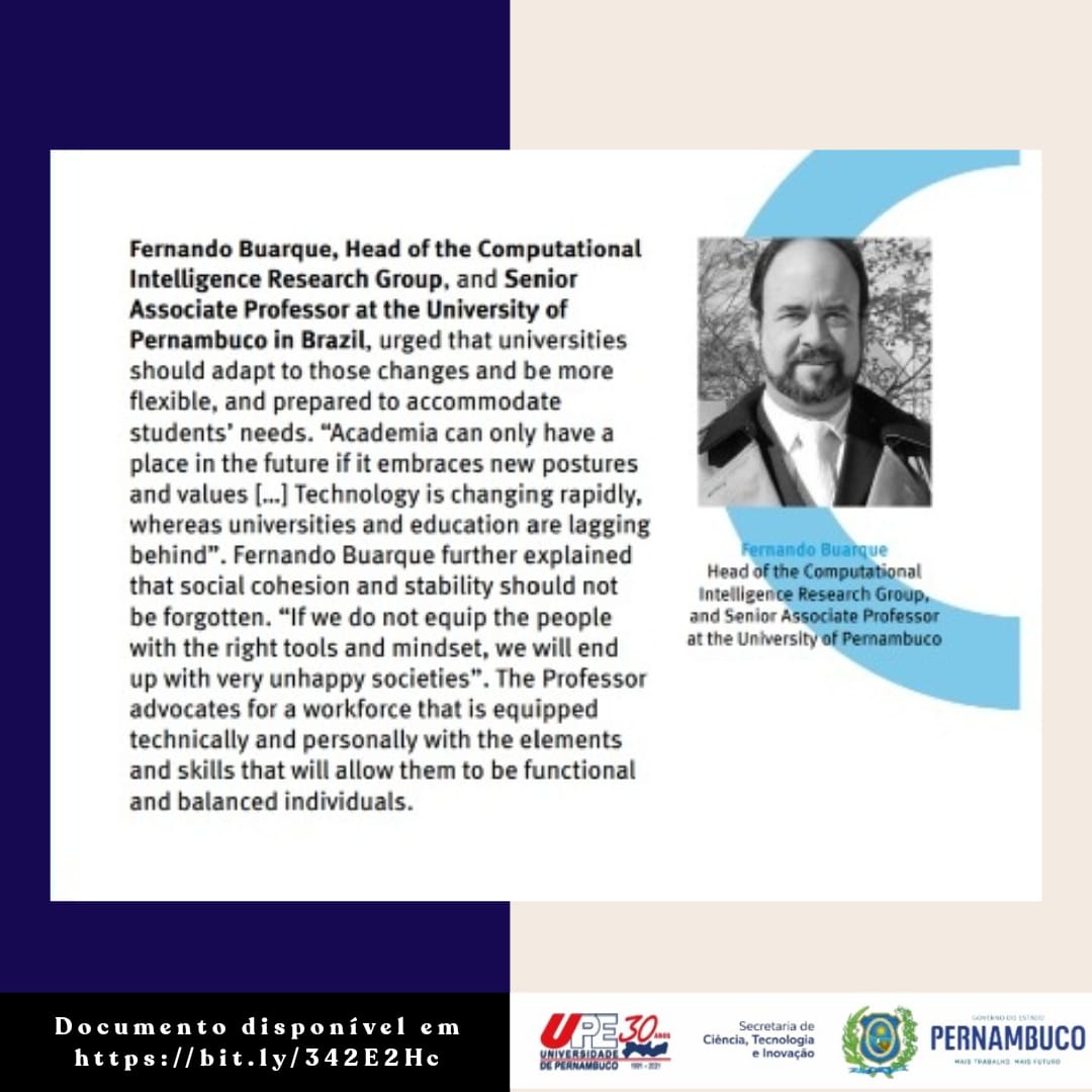 Professor da Escola Politécnica (Poli-UPE), onde é membro permanente do Programa de Doutorado em Engenharia de Computação, Fernando Buarque integrou um painel intitulado "Como podemos apoiar com a formação em um cenário de mudanças e com necessidades diversificadas".
