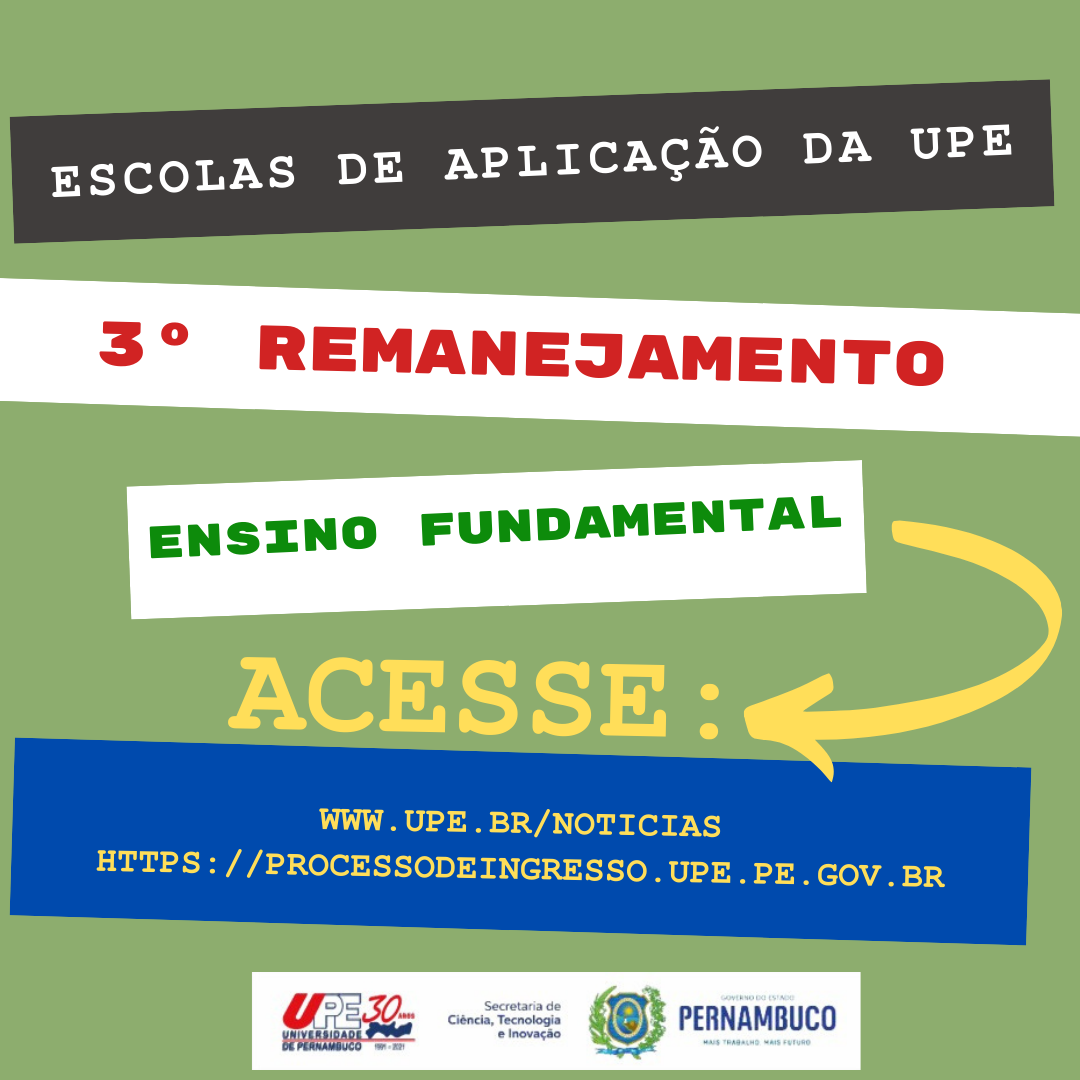 A Comissão Permanente de Concursos Acadêmicos da Universidade de Pernambuco (UPE) divulgou o terceiro remanejamento do Processo Seletivo 2022 das Escolas de Aplicação relativo às unidades de Nazaré da Mata e de Petrolina.