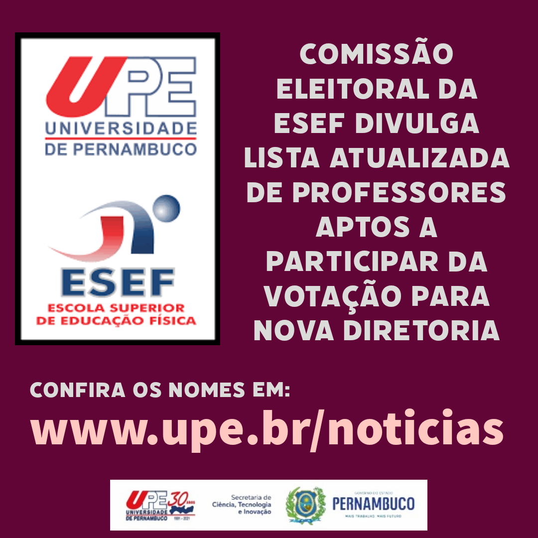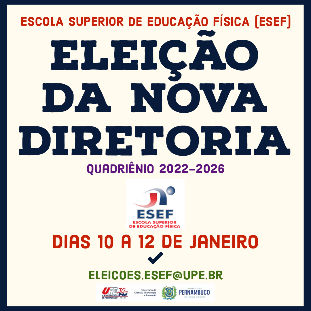 Votaram de forma paritária professores, servidores e alunos de graduação e pós-graduação da ESEF. A Chapa 1, "ESEF Conectada - Inovar para Avançar Com a Diversidade", que tinha como candidatos Jorge Bezerra (diretor) e Carlos Augusto Mulatinho de Queiroz Pedroso (vice-diretor), obteve 39,4% dos votos.