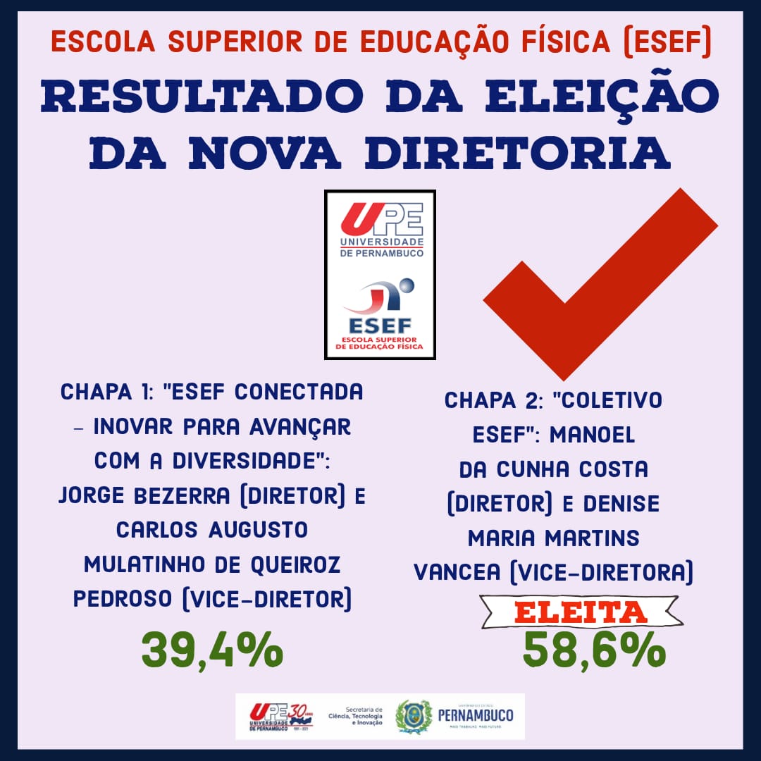 Chapa 2, com Manoel da Cunha Costa e Denise Vancea, vence as eleições para a nova diretoria da ESEF/UPE