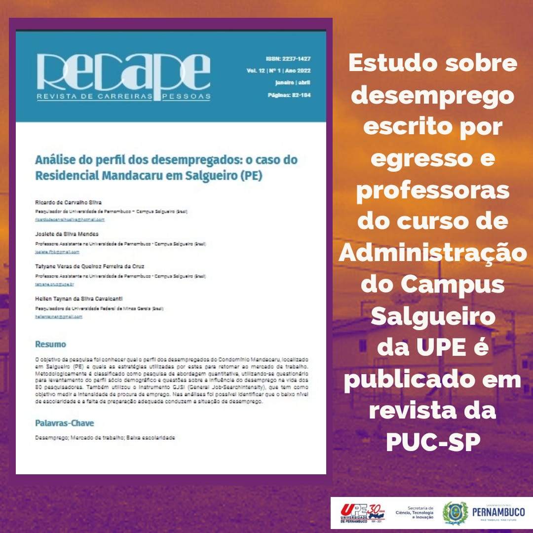 A Revista de Carreiras e Pessoas (Recape), editada pela Pontifícia Universidade Católica de São Paulo (PUC-SP), traz em sua edição de janeiro de 2022 um artigo produzido por um egresso e duas docentes do Campus Garanhuns da Universidade de Pernambuco (UPE), além de uma pesquisadora da Universidade Federal de Minas Gerais (UFMG).