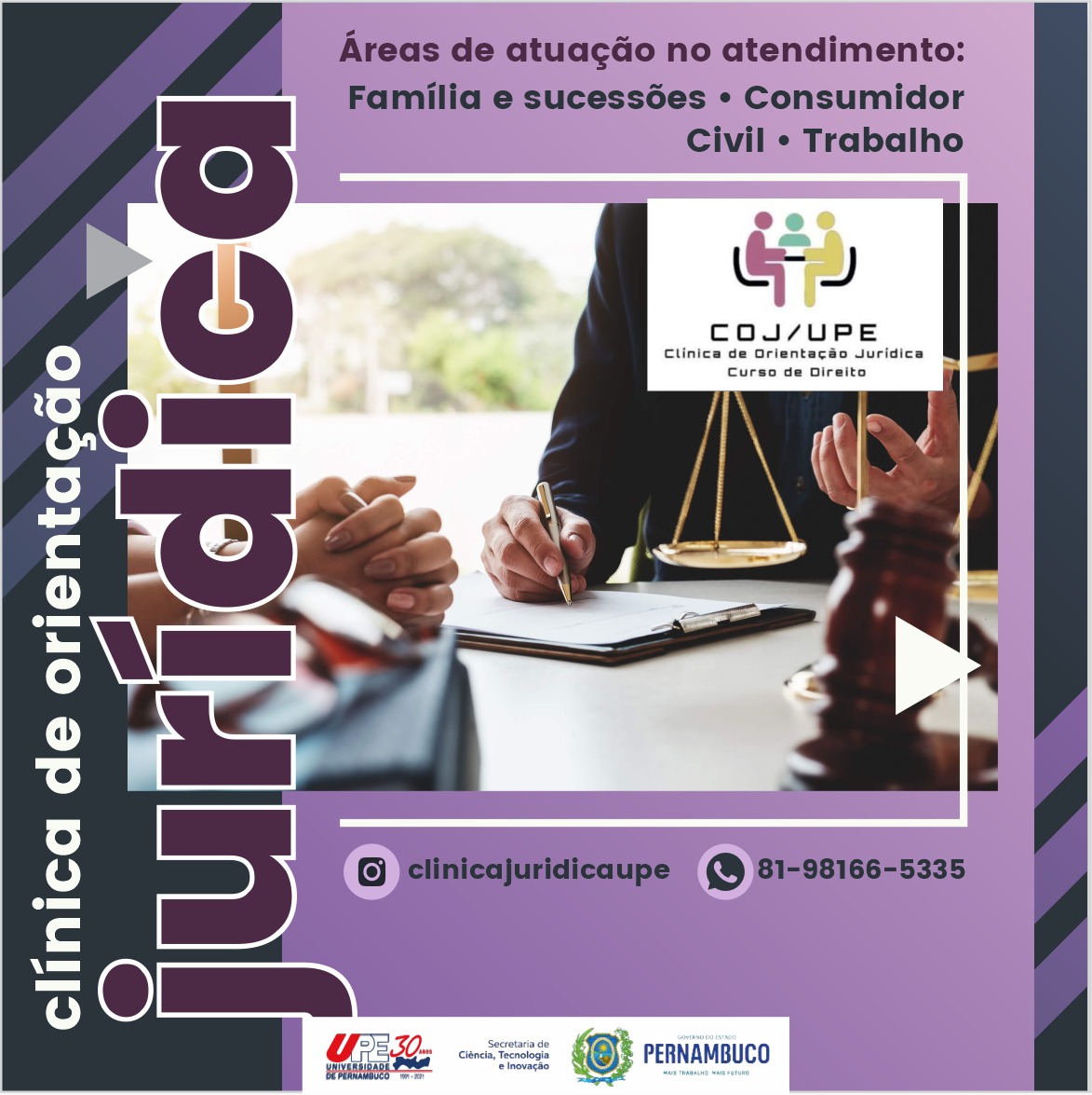 Os cursos de Direito dos campi Benfica e Arcoverde da Universidade de Pernambuco inauguraram a Clínica de Orientação Jurídica (COJ), projeto permanente que garante aos acadêmicos a prática real desde o primeiro ano da graduação e oferece atendimento gratuito à população.