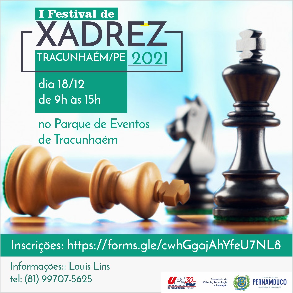 O I Festival da Cidade de Tracunhaém de Xadrez integra as ações do projeto de extensão da UPE Xadrez nas Escolas, coordenado pelo docente do curso de licenciatura em Matemática Gerson Henrique da Silva, nascido no município. O evento fará homenagens aos professores e também enxadristas Rinaldo José de Lima e Cláudio Roberto Barroso da Silva.