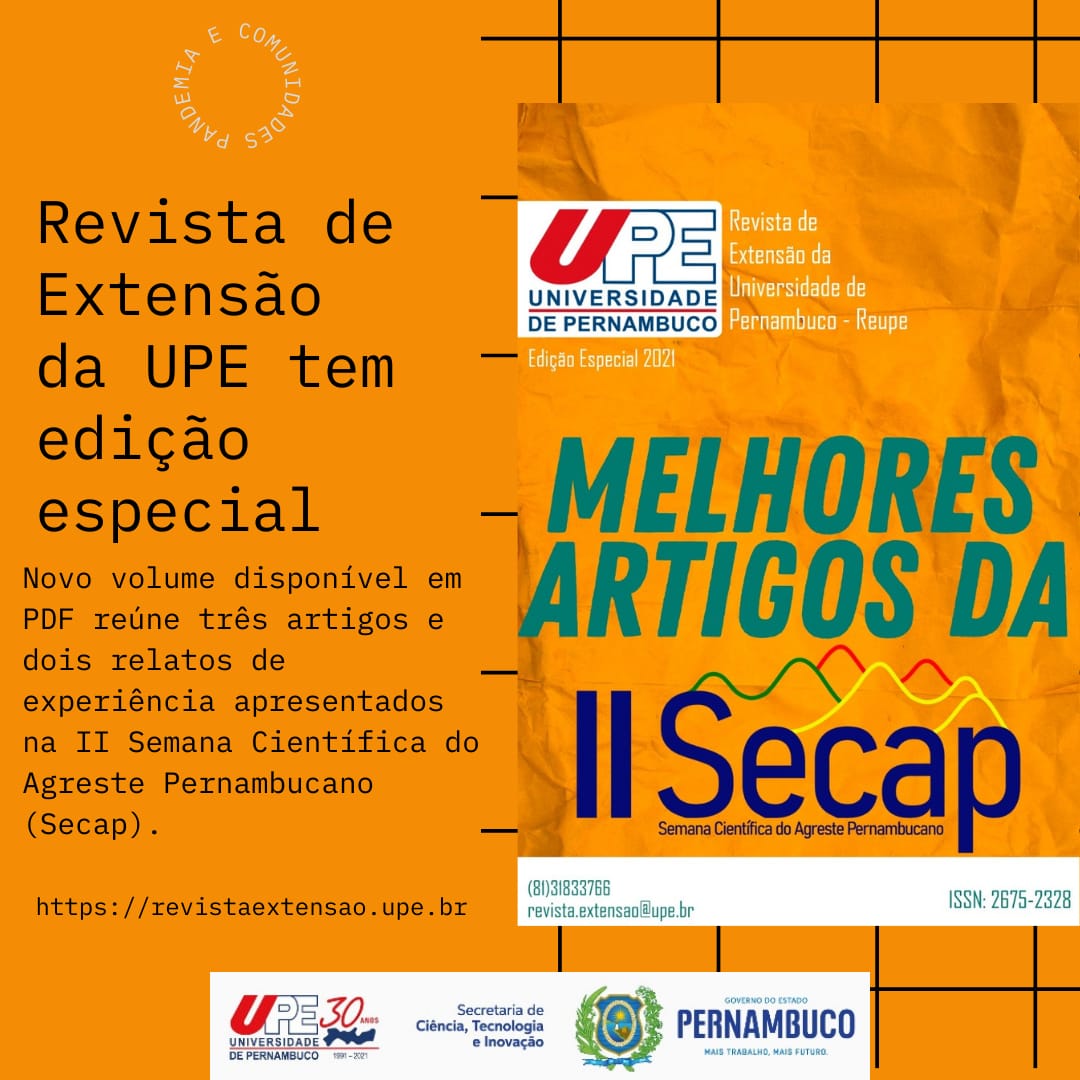A Revista de Extensão da Universidade de Pernambuco (Reupe) está com uma edição especial reunindo os melhores artigos da II Semana Científica do Agreste Pernambuco (Secap). A publicação em formato PDF pode ser acessada, assim como as revistas anteriores, no endereço https://www.revistaextensao.upe.br/index.php/reupe.