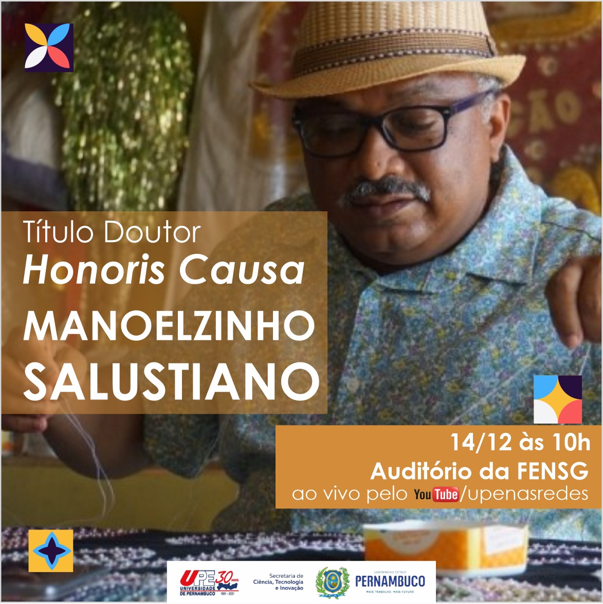 Mestre do bordado, mestre de dança, folgazão do Maracatu de Baque Solto, instrumentista, educador/formador das culturas populares, gestor e produtor cultural, palestrante e representante de Pernambuco e do Brasil em diversos eventos, Manoelzinho Salustiano foi agraciado em agosto deste ano com Mestre de Notório Saber pela UPE.