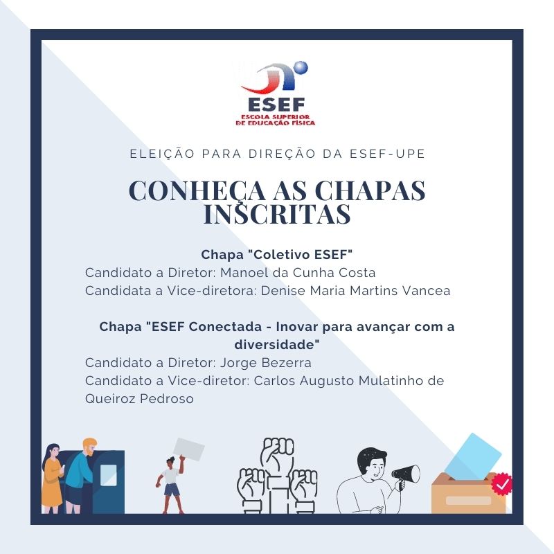 A Comissão Eleitoral da Escola Superior de Educação Física da Universidade de Pernambuco (ESEF/UPE) divulgou as chapas inscritas e seus respectivos candidatos para a votação que vai ocorrer de forma online entre os dias 10 e 12 de janeiro de 2022.