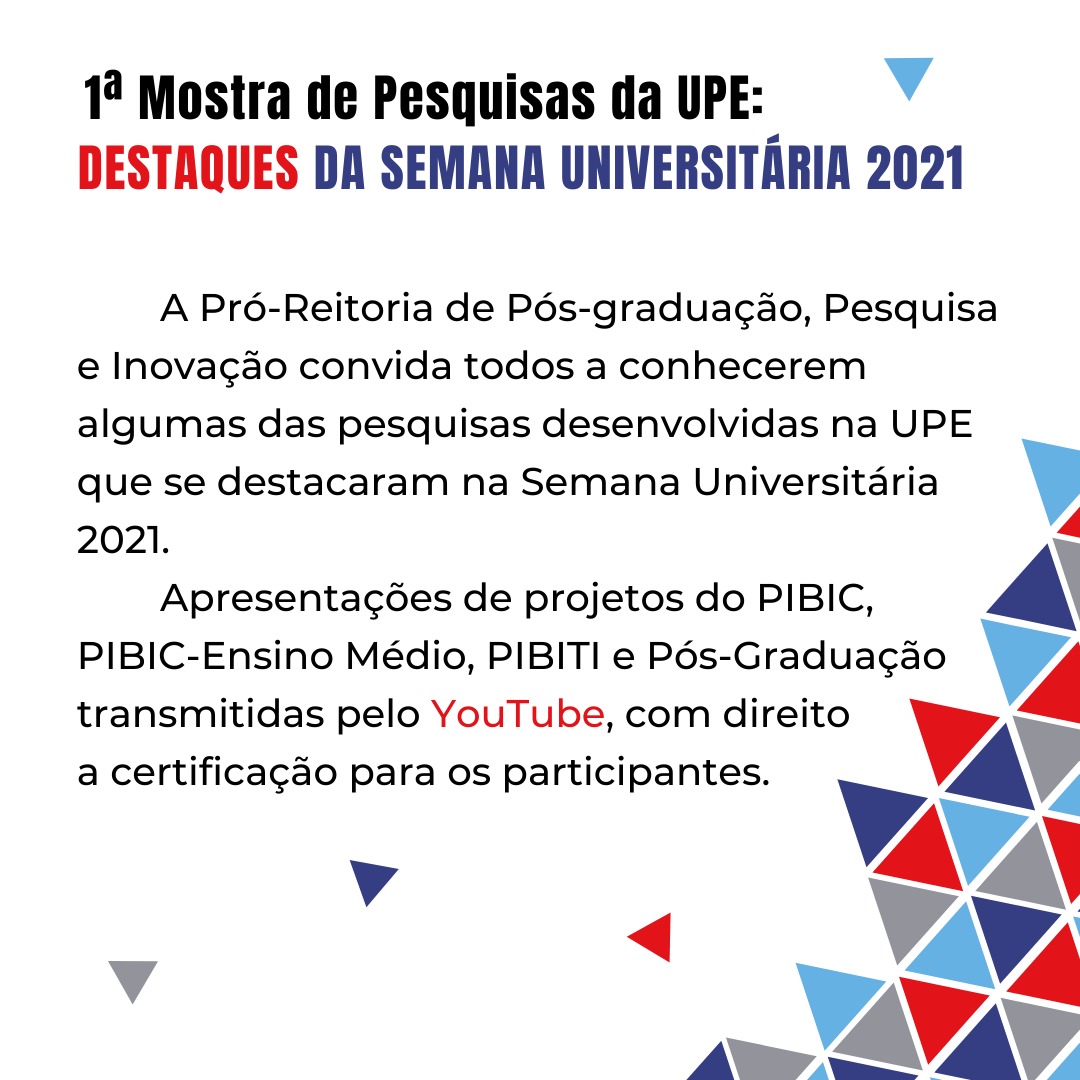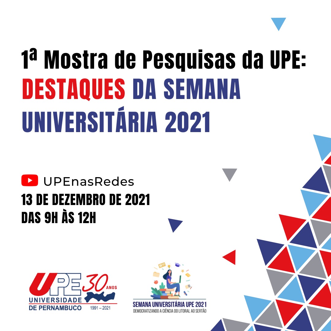A Pró-reitoria de Pós-graduação, Pesquisa e Inovação (Propegi) realiza, na segunda-feira (13), a 1ª Mostra de Pesquisas da Universidade de Pernambuco: Destaques da Semana Universitária - 2021.