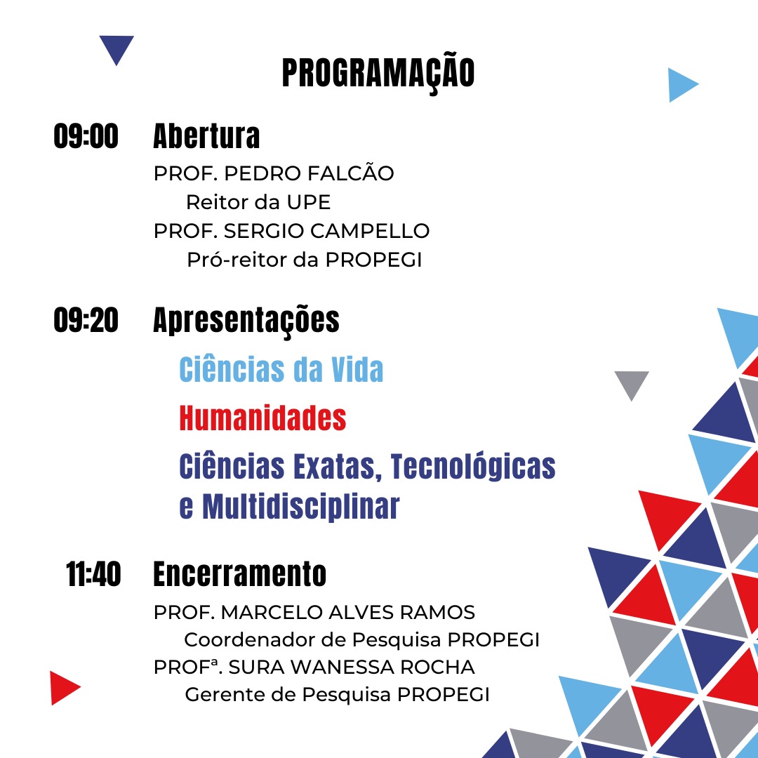 Com transmissão pelo canal UPE nas Redes no YouTube, das 9h às 12h, o evento vai apresentar nove trabalhos de relevância em três grandes áreas de conhecimento: a) Ciências da Vida; b) Humanidades e c) Ciências Exatas, Tecnológicas e Multidisciplinar.