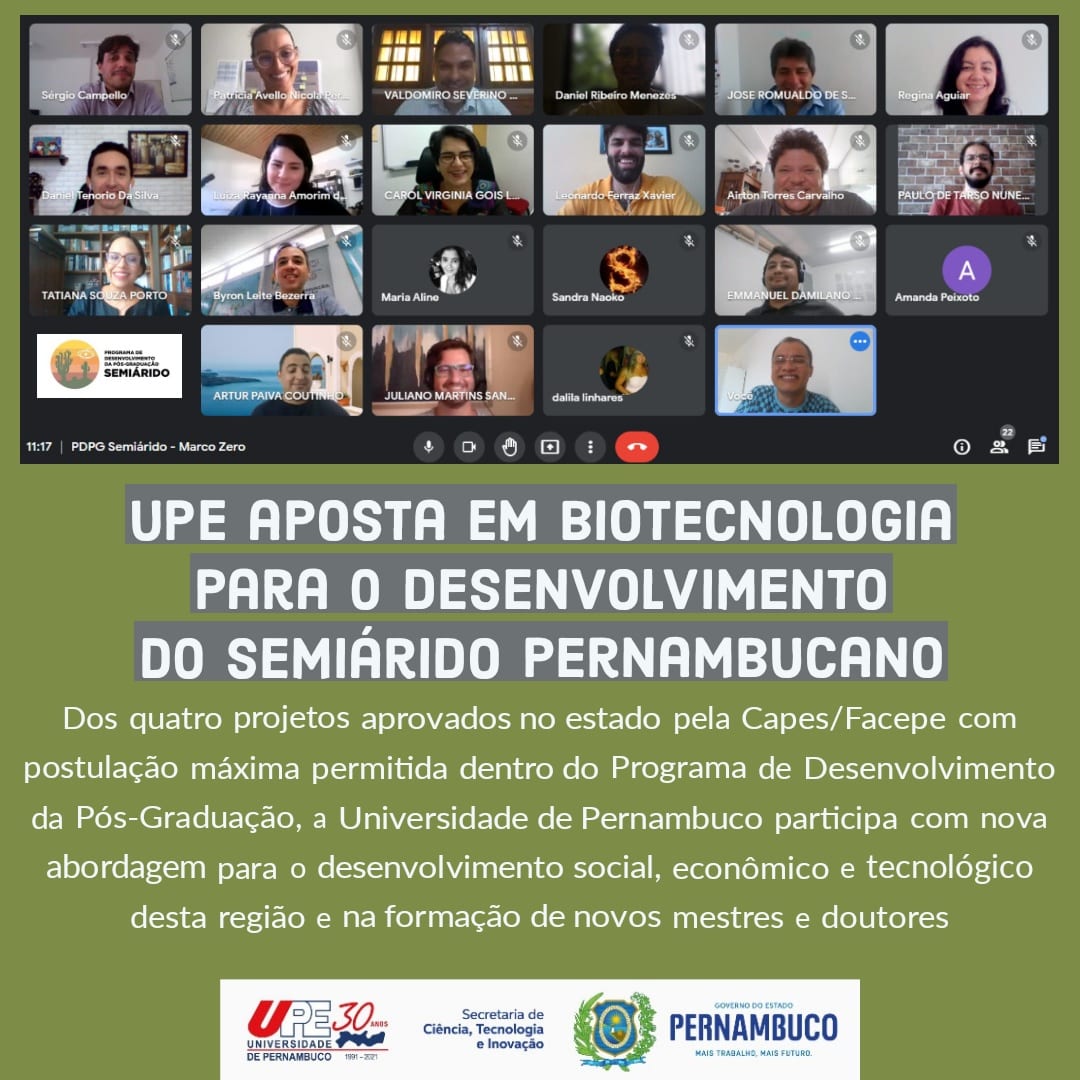 Na primeira reunião online, a UPE foi representada pelo pró-reitor de Pós-Graduação, Pesquisa e Inovação, Sérgio Campello, pelo coordenador-geral de Pós-Graduação, Byron Leite, pela coordenadora do Programa de Pós-Graduação em Ciência e Tecnologia Ambiental (PPGCTA), Regina Aguiar e pela coordenadora do Programa de Pós-Graduação em Saúde e Desenvolvimento Socioambiental (PPGSDS), Luiza Lima.