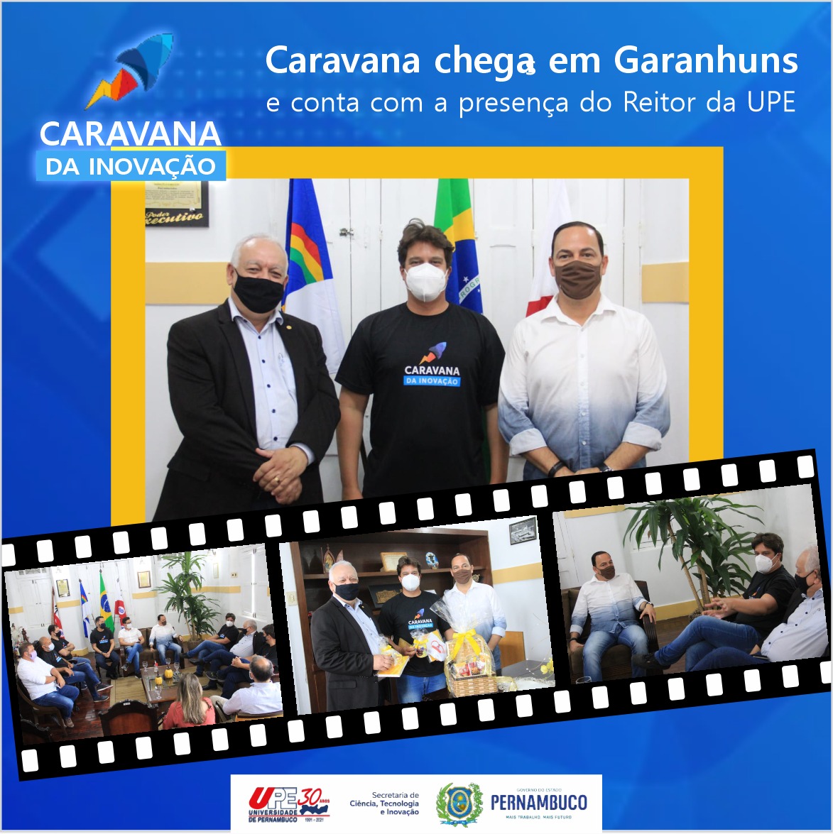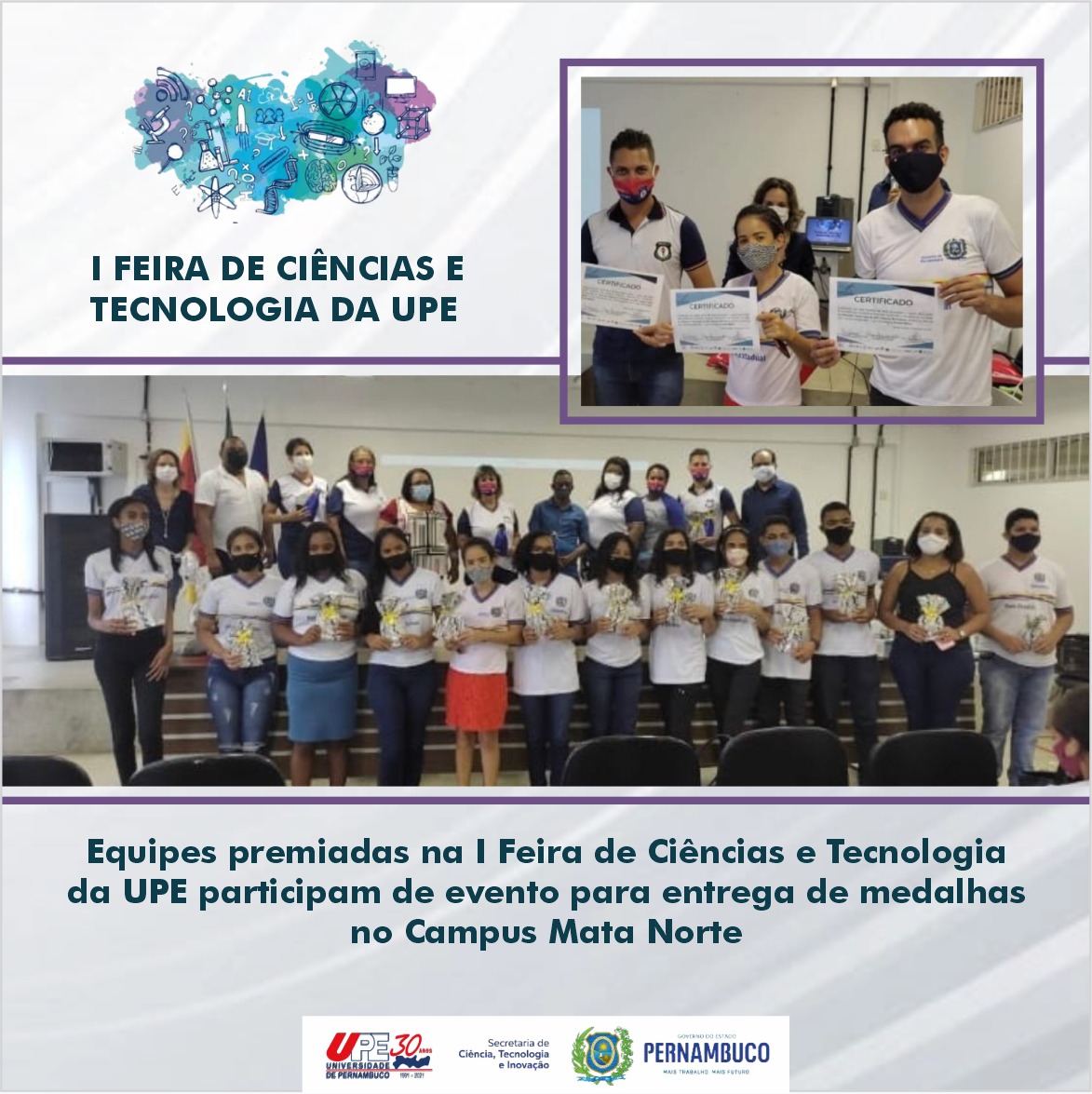 As equipes premiadas na I Feira de Ciências e Tecnologia da UPE, promovida pelo campus Mata Norte em julho deste ano, foram recebidas no último dia 17 de novembro de 2021 para a entrega dos certificados e medalhas das 5 categorias. Foi o primeiro encontro presencial desde a suspensão das aulas presenciais devido à pandemia. O evento atendeu a todos os protocolos de segurança sanitária.