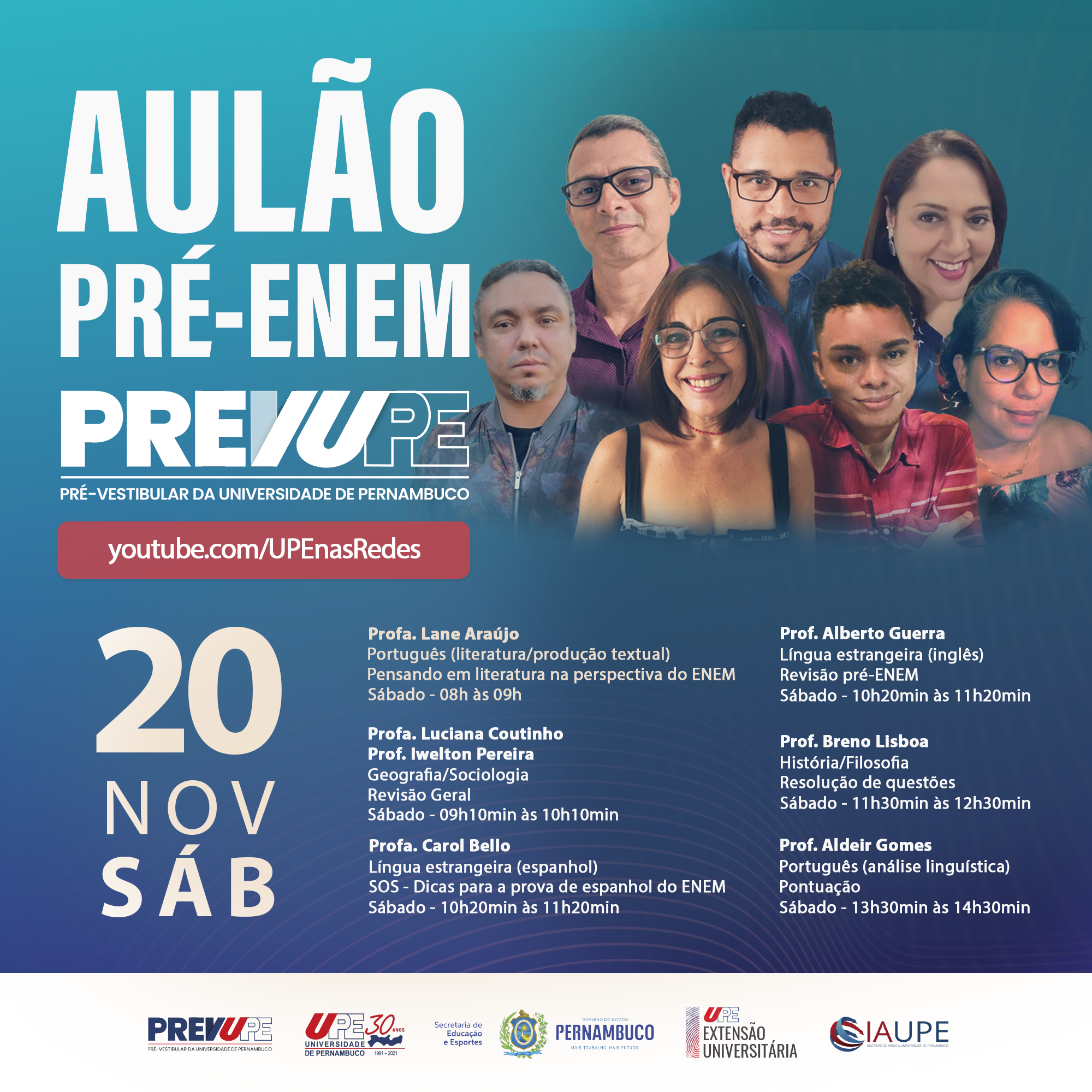 O pré-vestibular da Universidade de Pernambuco (Prevupe) inicia os seus aulões preparatórios, neste sábado (20) e no dia 27 de novembro, para os estudantes que vão prestar o Exame Nacional do Ensino Médio (Enem).