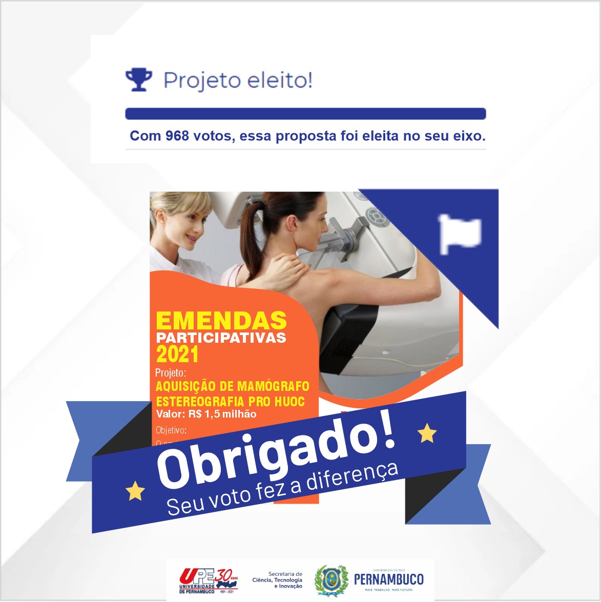 A Universidade de Pernambuco está de parabéns. O projeto “Aquisição de mamógrafo com estereografia para o Hospital Universitário Oswaldo Cruz” no valor de R$ 1,5 milhão foi contemplado com recursos públicos provenientes de emendas parlamentares. Os resultados foram divulgados nesta quarta-feira (17).