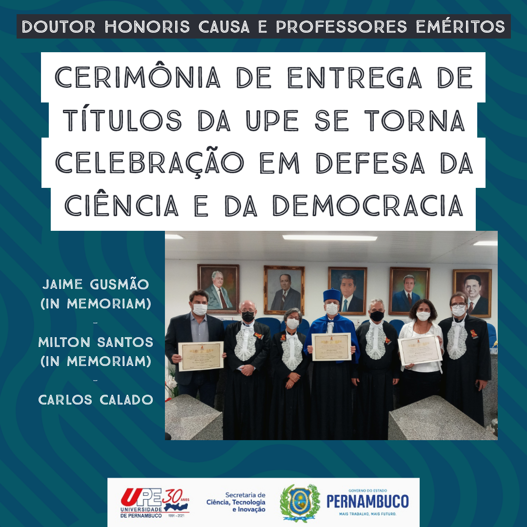 A partir desta sexta-feira (12), os três têm mais uma característica em comum. Integram o seleto quadro da Universidade de Pernambuco (UPE) como Doutor Honoris Causa (Jaime Gusmão, in memoriam) e Professores Eméritos (Milton Santos, in memoriam, e Carlos Calado).