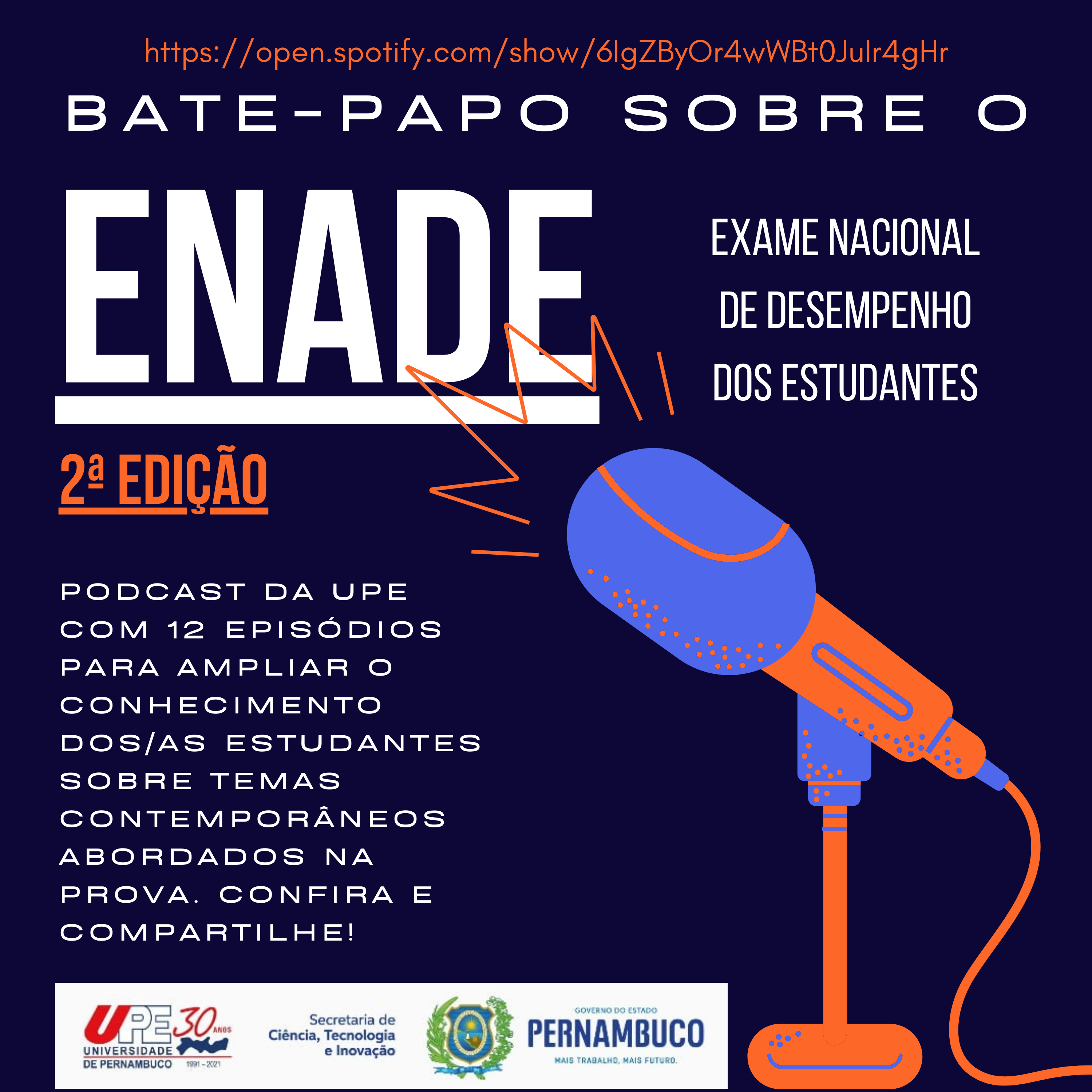 Iniciativa da Pró-Reitoria de Graduação (PROGRAD) da Universidade de Pernambuco, a série de podcasts "Bate-papo sobre o Enade" chega à sua segunda edição reunindo 12 episódios em que docentes e técnicos da UPE debatem temas contemporâneos para ajudar na preparação para a prova de Formação Geral do Exame Nacional de Desempenho dos Estudantes.