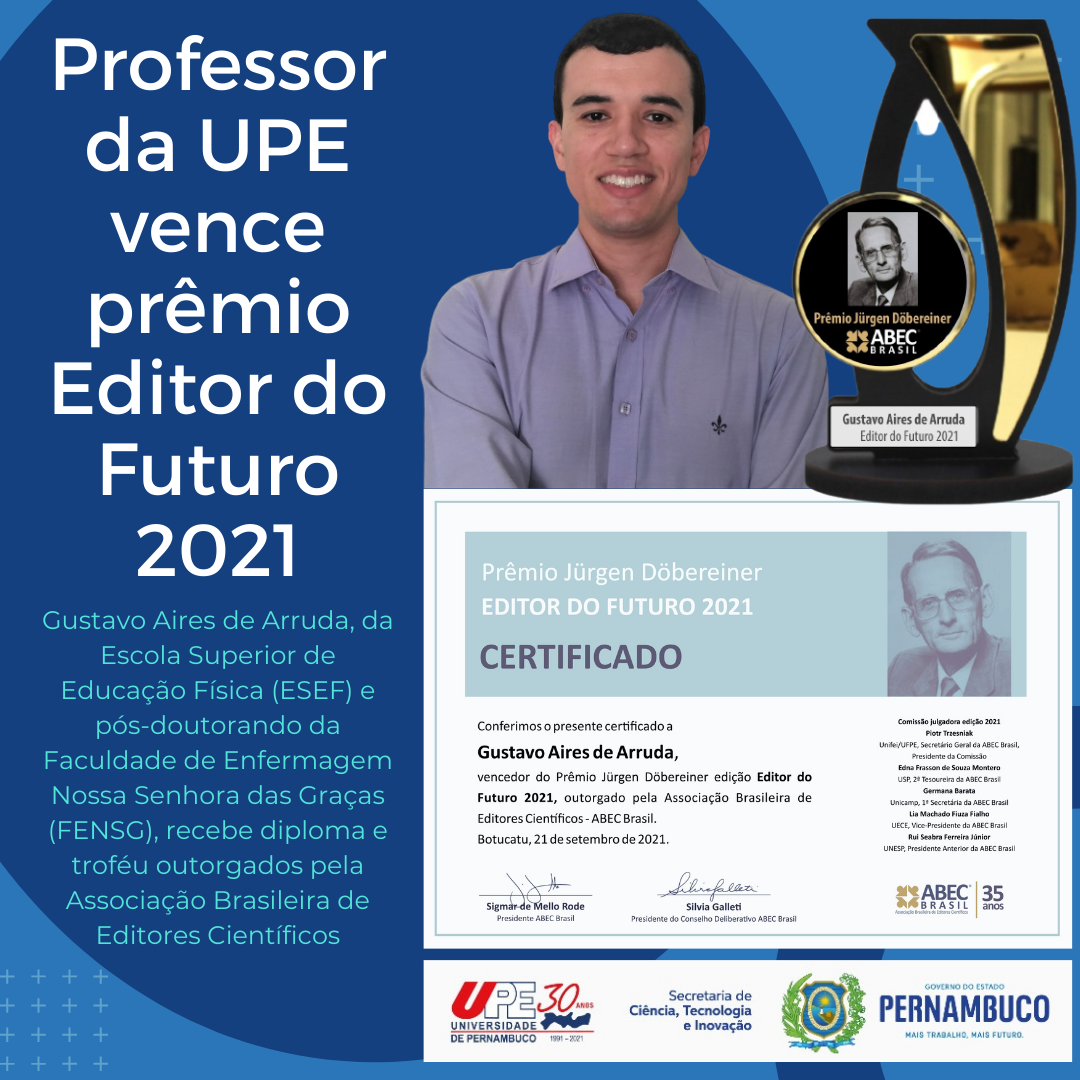 Recém-empossado professor assistente da Escola Superior de Educação Física (ESEF) e pós-doutorando do Programa Associado em Enfermagem da Faculdade de Enfermagem Nossa Senhora das Graças (FENSG/UPE/UEPB), Gustavo Aires de Arruda recebeu o Prêmio Jürgen Döbereiner 2021 – Modalidade Editor do Futuro.