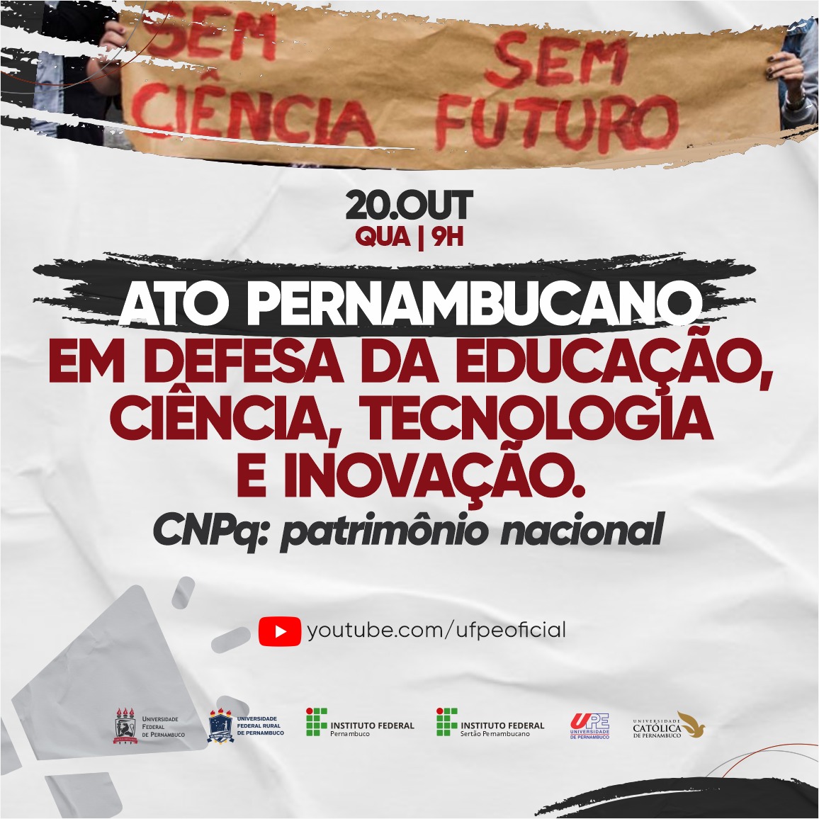 Frente ao recente cenário de cortes de recursos para o fomento à ciência no Brasil, a Universidade de Pernambuco (UPE) e outras seis instituições de ensino do Estado promovem o “Ato Pernambuco em Defesa da Educação, Ciência, Tecnologia e Inovação – CNPq: patrimônio nacional”. A manifestação pública em apoio à mobilização nacional em defesa da ciência contará com a participação de reitores, vice-reitores, representantes de entidades científicas e da sociedade, e será realizada nesta quarta-feira (20), a partir das 9h, com transmissão ao vivo pelo canal da UFPE no YouTube.