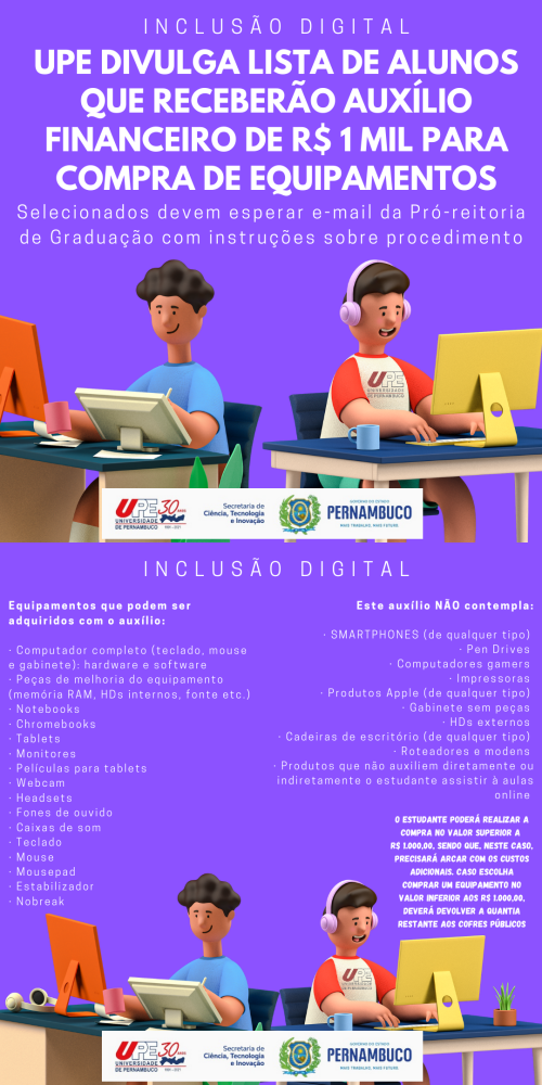 A Universidade de Pernambuco divulgou a lista dos alunos de cursos de graduação aprovados no edital Auxílio para Inclusão Digital - Modalidade Equipamentos. Ao todo, 340 estudantes receberão benefícios no valor individual de R$ 1 mil para aquisição de equipamentos que auxiliem o desenvolvimento e a continuidade das atividades acadêmicas dos contemplados.