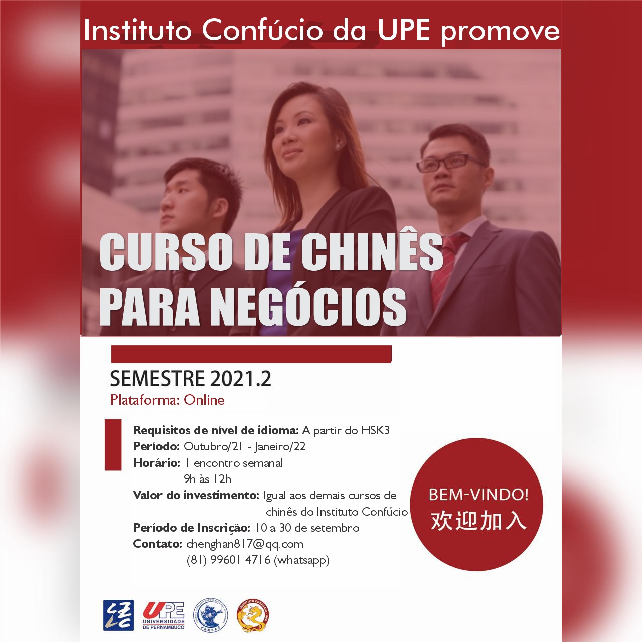 O Instituto Confúcio da Universidade de Pernambuco está com inscrições abertas, até o dia 30 de setembro, semestre 2021.2, para o seu curso de chinês para negócios, no formato online. As aulas ocorrerão entre os meses de outubro/21 a janeiro de 2022, sendo uma vez por semana, no horário das 9h às 12h.