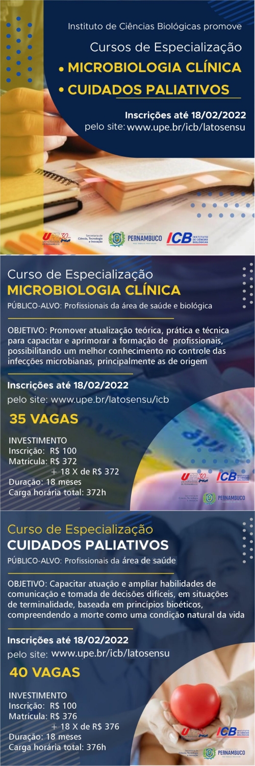 O Instituto de Ciências Biológicas da Universidade de Pernambuco (ICB/UPE) abriu inscrições para os cursos de especialização em Microbiologia Clínica e em Cuidados Paliativos.